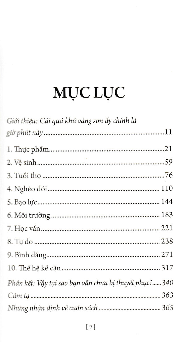 Thế giới của chúng ta dường như đang sụp đổ. Mỗi ngày tin tức xoay quanh việc báo cáo tình trạng suy thoái: ở phương Tây các đảng phái chính trị mâu thuẫn, rồi những vấn đề phân biệt, nghèo đói, chiến tranh, bất bình đẳng, nạn đói trên khắp thế giới. Trong khi các chính trị gia, nhà báo và nhà hoạt động từ mọi phía nói về những thiệt hại đã xảy ra, thì Johan Norberg đưa ra một phân tích sáng tỏ và khích lệ về việc chúng ta đã tiến được bao xa trong việc giải quyết những vấn đề lớn nhất mà nhân loại đang phải đối mặt. Dù đối mặt với nỗi sợ hãi, bóng tối và sự chia rẽ nhưng có một sự thật rõ ràng là chúng ta đang sống ở thời kỳ hoàng kim.