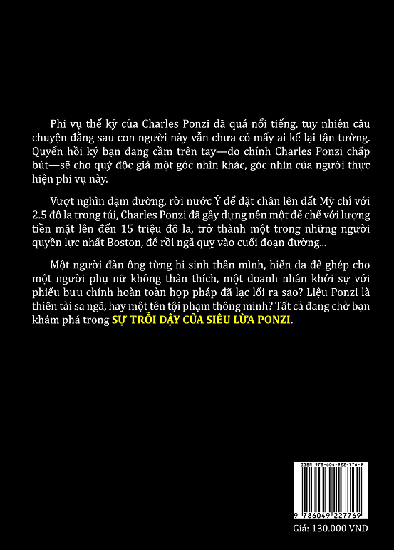 Phi vụ thế kỷ của Charles Ponzi đã quá nổi tiếng, tuy nhiên câu chuyện đằng sau con người này vẫn chưa có mấy ai kể lại tận tường. Quyển hồi ký bạn đang cầm trên tay—do chính Charles Ponzi chấp bút—sẽ cho quý độc giả một góc nhìn khác, góc nhìn của người thực hiện phi vụ này.