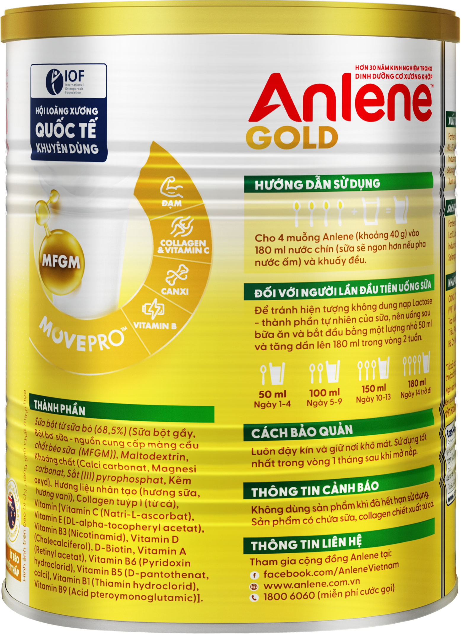ANLENE GOLD LÀ SẢN PHẨM SỮA CHỨA HỆ DƯỠNG CHẤT MOVEPROCung cấp dinh dưỡng tăng cường với hoạt chất MFGM được KIỂM NGHIỆM LÂM SÀNG, giúp cơ thể thêm linh hoạt và Vitamin B tiếp thêm năng lượng.   ĐẶC ĐIỂM NỔI BẬT • Đạm cho cơ chắc • Canxi cho xương khỏe • Collagen & Vitamin C cho khớp linh hoạt • Vitamin B giúp thêm năng lượng • Hoạt chất MFGM giúp:  ◦ Tăng 2 lần độ dẻo dai  ◦ Tăng 3 lần khả năng thăng bằng  ◦ Tăng 40% khối lượng cơ Uống Anlene Gold – Trẻ khỏe vững vàngAnlene – Nhãn hiệu được Hội Loãng Xương Quốc Tế khuyên dùng, giúp giảm nguy cơ lão hóa xương và tăng cường sức khỏe cơ sau 4 tuần.   HƯỚNG DẪN SỬ DỤNG • Cho 4 muỗng Anlene Gold (khoảng 40g) vào 180ml nước chín  ◦ Sữa sẽ ngon hơn nếu pha nước ấm  ◦ Khuấy đều   ĐỐI VỚI NGƯỜI LẦN ĐẦU TIÊN UỐNG SỮA • Để tránh hiện tượng không dung nạp Lactose – thành phần tự nhiên của sữa  ◦ Nên uống sau bữa ăn  ◦ Bắt đầu bằng một lượng nhỏ 50ml và tăng dần lên 180ml trong vòng 2 tuần   THÔNG TIN CẢNH BÁO • Không dùng sản phẩm khi đã hết hạn sử dụng • Sản phẩm có chứa sữa, collagen chiết xuất từ cá và sản phẩm từ đậu nành • HSD: 24 tháng • Xuất xứ: Malaysia • Đây không phải là thuốc và không có tác dụng thay thế thuốc chữa bệnh