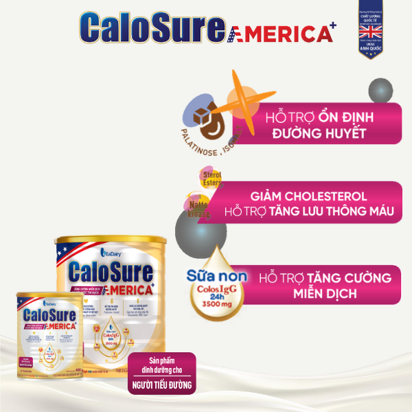 - Hỗ Trợ Ổn Định Đường Huyết: Calosure America+ (tiểu đường) cung cấp một chế độ dinh dưỡng cân đối, lành mạnh, sử dụng hệ bột đường cao cấp Isomalt, Palatinose (Isomaltulose) và Fructose – các chất bột đường có chỉ số đường huyết thấp, hấp thu chậm và từ từ, giúp ổn định đường huyết sau khi uống và ưu tiên lựa chọn cho người tiểu đường.