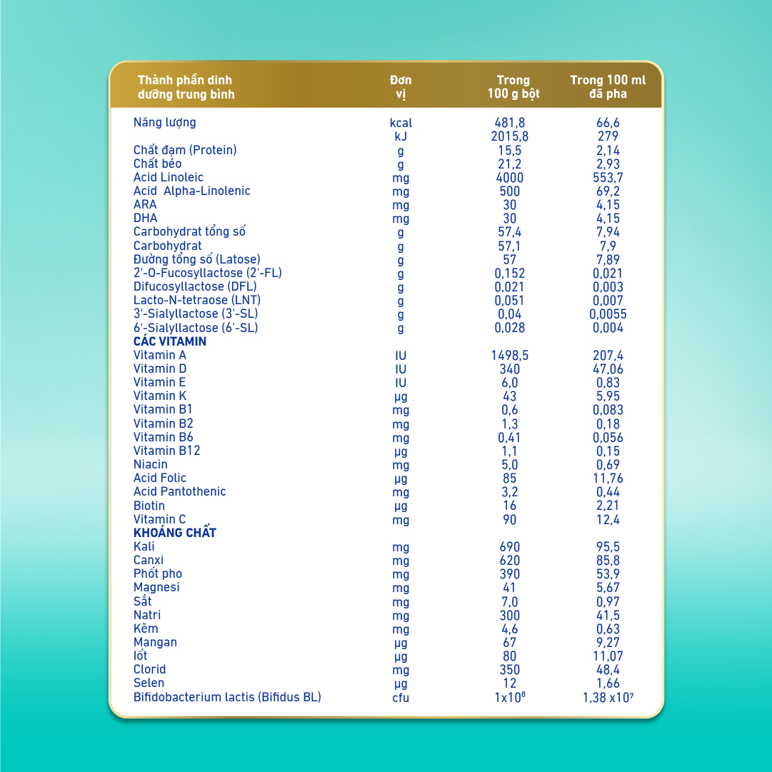 - 100 triệu lợi khuẩn Bifidus BL: được nghiên cứu giúp giảm 49% nguy cơ tiêu chảy ở trẻ dưới 1 tuổi. HỖ TRỢ CHIỀU CAO VÀ TRÍ NÃO