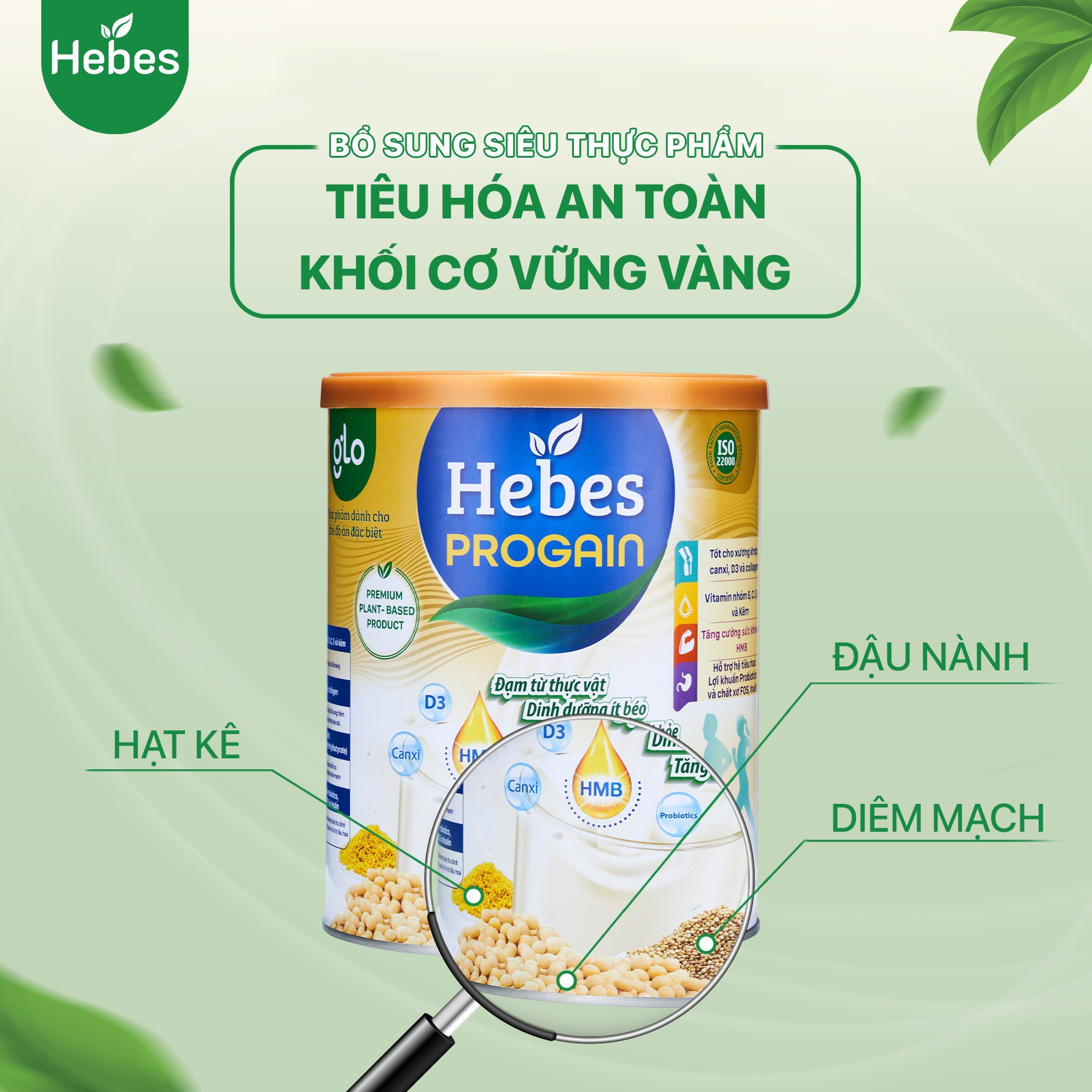 Mua tại TiktokHEBES PROGAIN VỚI CÔNG THỨC ĐỘC QUYỀN 100% TỪ THỰC VẬT VÀ BỔ SUNG HMB GIÚP PHỤC HỒI VÀ GIẢM THIỂU TÌNH TRẠNG NHỨC MỎI CƠ Giới thiệu BỔ SUNG NĂNG LƯỢNG, PHỤC HỒI CƠ VÀ THỂ CHẤT CHO NGƯỜI LỚN TUỔI, NGƯỜI ỐM YẾU CẦN PHỤC HỒI THỂ LỰC Chỉ 2 ly HEBES PROGAIN mỗi ngày, tăng cường khối cơ lành mạnh với công thức kết hợp đạm thực vật cùng dưỡng chất vàng HMB (2,1g/45g bột), dưỡng chất vàng giúp cải thiện scws mạnh và chức năng cơ ở người cao tuổi.
