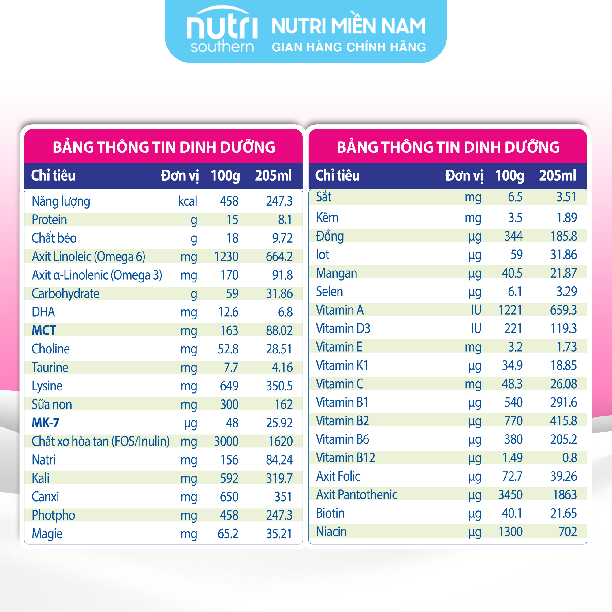 Năng lượng (Energy) 458 Kcal (1.2kcal/ml), Protein 15g, Chất béo 18g, Axit Linoleic (Omega 6) 1230mg, Axit a-Linoleic (Omega 3) 170mg, Carbohydrate 59g, DHA 12.6mg, MCT 163mg, Choline 52.8mg, Taurine 7.7mg, Lysine 649mg, Colostrum 300mg, MK-7 (MenaQ7) 48mcg, Chất xơ hòa tan (FOS/Inulin) 3000mg, Natri 156mg, Kali 592mg, Canxi 650mg, Photpho 458mg, Magie 65.2mg, Sắt 6.5mg, Kẽm 3.5mg, Đồng 344mcg, Iod 59mcg, Mangan 40.5mcg, Selen 6.1mcg, Vitamin A 1221 IU, Vitamin D3 221IU, Vitamin E 3.2mg, Vitamin K1 34.9mcg, Vitamin C 48.3mg, Vitamin B1 540mcg, Vitamin B2 770mcg, Vitamin B6 380 mcg, Vitamin B12 1.49mcg, Axit Folic 72.7mcg, Axit Pantothenic 3450mcg, Biotin 40.1mcg, Niacin 1300mcg.