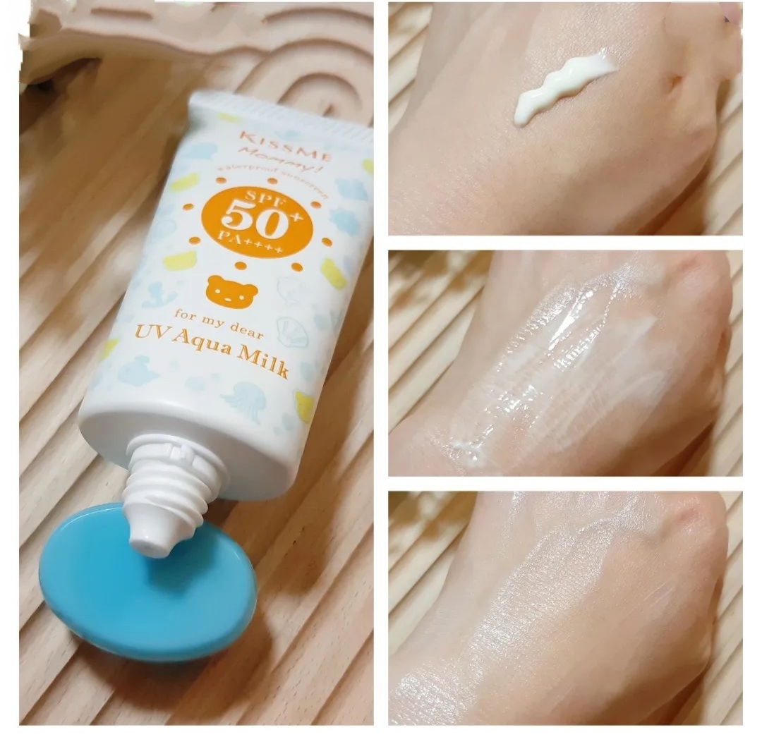 Mua tại TiktokSữa Chống Nắng Và Dưỡng Ẩm Dành Cho Bé Từ 6 Tháng Tuổi Và Làn Da Nhạy Cảm Kissme Mommy UV Aqua Milk (Dùng Được Cho Da Mặt) Thông tin sản phẩm: Số Lô: In trên sản phẩm Thương hiệu Kissme Xuất Xứ: Nhật Bản Khối lượng tịnh: 50g HSD: 5 năm kể từ ngày sản xuất Gel chống nắng MOMMY N có chỉ chống nắng SPF50 PA++++ (khả năng chống 96% tia cực tím, với thời gian gần 500 phút), được chiết xuất từ 80% thành phần thực phẩm, giàu hàm lượng dưỡng ẩm tự nhiên như: Tinh dầu hoa Jojoba, tinh dầu hạt Macadamia, quả mâm xôi, nha đam, đặc biệt sơ ri vuông từ Bắc Mỹ giàu hàm lượng Vitamin A,C,K,E ,B1,B12…vừa hỗ trợ chống nắng, vừa duy trì độ ẩm, tránh khô da, giúp cho da Bé luôn mịn màng, khoẻ đẹp. Dạng Gel mỏng nhẹ như nước, dễ thấm vào da, tạo cho làn da mỏng manh của Bé cảm giác nhẹ nhàng, không bết rít khó chịu trong quá trình sử dụng. Không chất phụ gia, không kích ứng da cho Bé. Sản phẩm chuyên có thể dùng cho cả Mẹ, và đặc biệt người có làn da nhạy cảm. Dễ dàng làm sạch khi rửa bằng nước. • CHUYÊN DỤNG CHO BÉ TỪ 06 THÁNG TUỔI VÀ NHỮNG BẠN CÓ LÀN DA NHẠY CẢM, PHỤ NỮ CÓ THAI…. 1/ Công dụng: