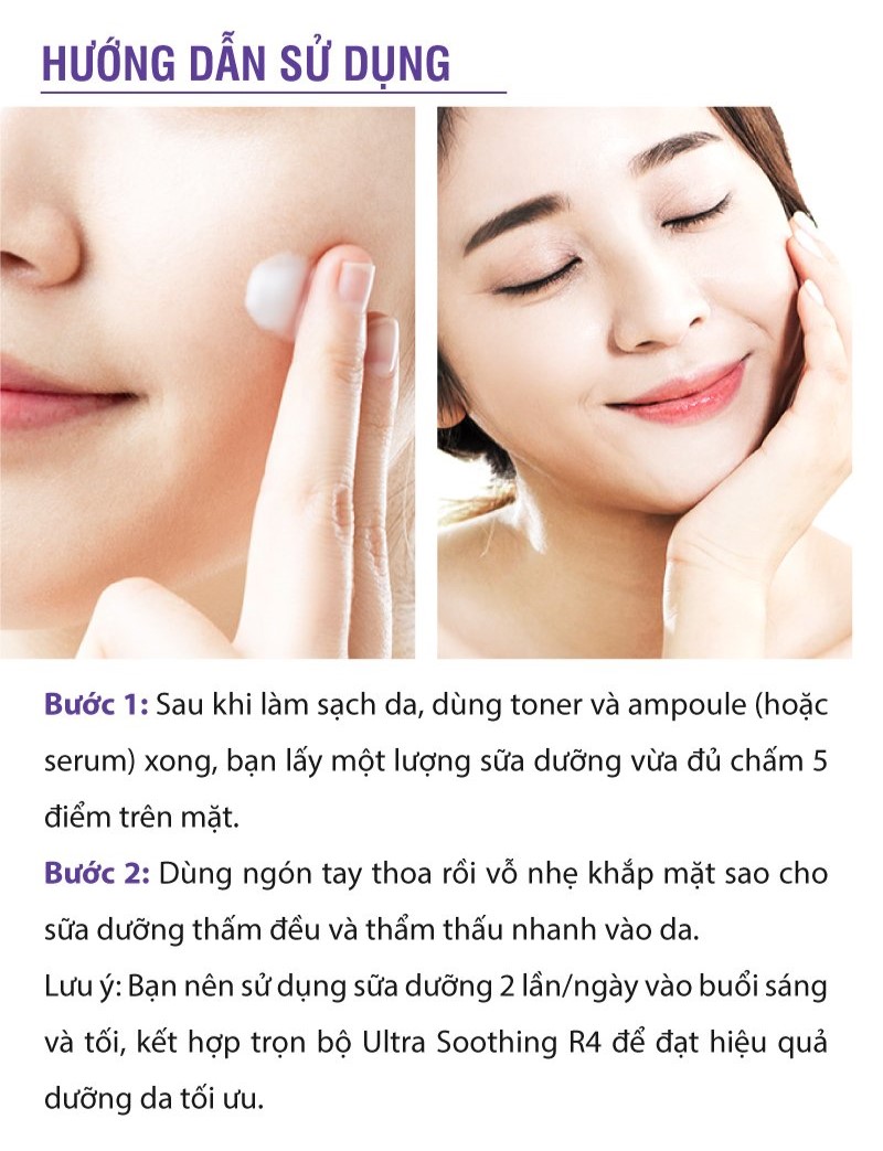 Bảo vệ da • HƯỚNG DẪN SỬ DỤNG Bước 1: Sau khi làm sạch da, dùng toner & ampoule (hoặc serum) xong, bạn lấy một lượng sữa vừa đủ chấm 5 điểm lên mặt. Bước 2: Dùng ngón tay thoa rồi vỗ nhẹ khắp mặt sao cho sữa dưỡng thấm đều và thẩm thấu nhanh vào da. Lưu ý: Bạn nên sử dụng sữa dưỡng 2 lần/ngày vào buổi sáng và tối, kết hợp trọn bộ Ultra Soothing R4 để đạt hiệu quả dưỡng da tối ưu. • THÔNG TIN SẢN PHẨM Xuất xứ thương hiệu: Hàn Quốc Nơi sản xuất: Hàn Quốc Ngày sản xuất: Xem trên bao bì sản phẩm Hạn sử dụng: 2 năm kể từ ngày sản xuất. **Bao bì thay đổi theo từng đợt nhập hàng