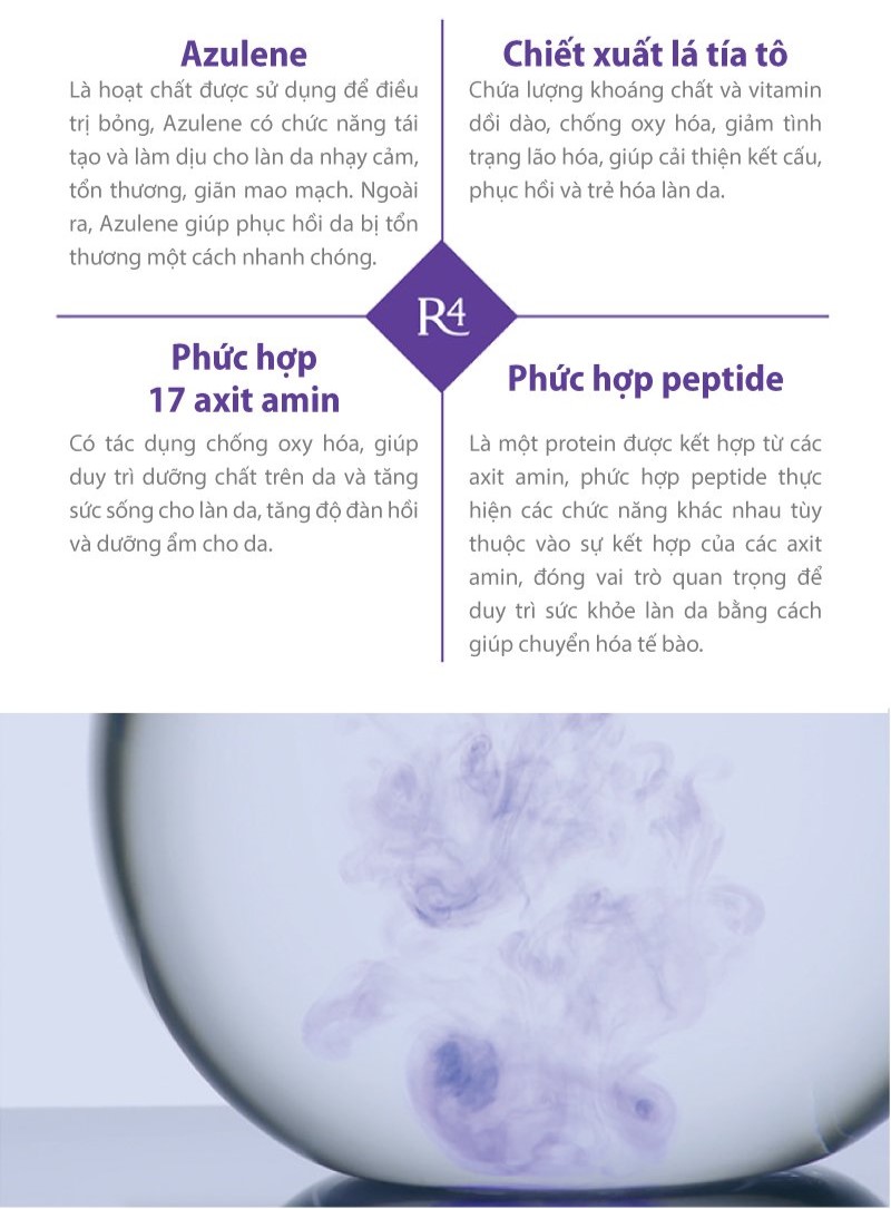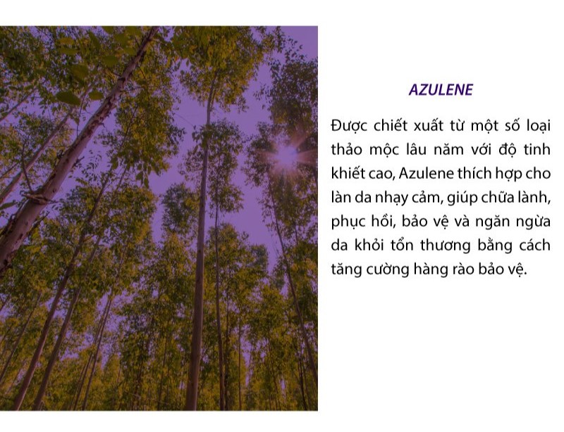 - Được tăng cường bổ sung Azulene giúp làm dịu tức thì, vỗ về ngay lập tức làn da bị kích ứng, mẩn đỏ, mỏng đỏ, tổn thương...