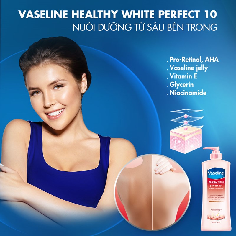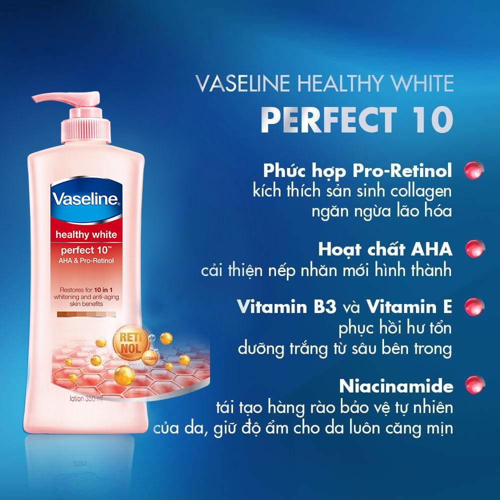 Với AHA & Pro-Retinol giúp loại bỏ tế bào chết, kích thích sản sinh collegen & giảm dần các nếp nhăn. Ứng dụng công thức đột phá với sự kết hợp các thành phần dưỡng trắng và ngăn ngừa lão hóa da vượt trội vào sữa dưỡng thể Vaseline Perfect 10 trong 1:
