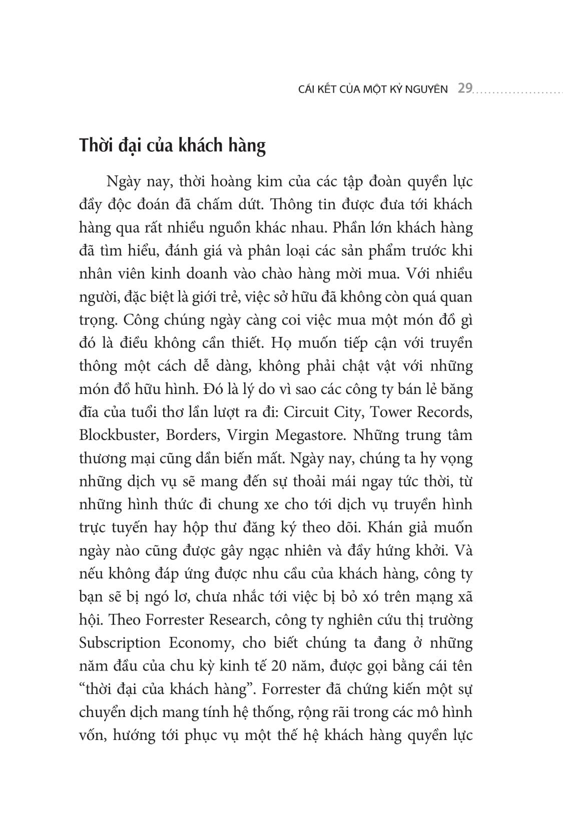 Trong hàng trăm năm qua, các trường kinh tế chỉ đơn giản dạy chúng ta một nguyên tắc: Mục tiêu nền tảng của mọi doanh nghiệp là tạo ra được một sản phẩm đột phá, tiêu thụ được càng nhiều trên thị trường càng tốt, giảm được chi phí cố định và giành lợi thế với biên lợi nhuận cao. Nhưng tác giả Tien Tzuo cho rằng, mô hình như vậy không còn phù hợp bởi lẽ tình thế đã thay đổi.