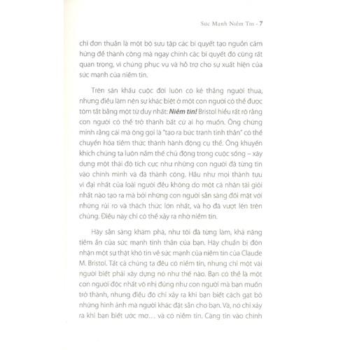 Sức mạnh niềm tin của Claude M. Bristol sẽ mang lại cho bạn đọc sự khích lệ và hỗ trợ mà các bạn đang cần. Nó chỉ ra một cách hết sức đơn giản nhưng đầy thuyết phục rằng phép ám thị luôn luôn có thể được sử dụng để cải thiện hiệu quả của bất kỳ công việc nào. Nó giải phóng mọi tiềm năng và giúp chúng ta tin ở chính mình, đó cũng là một kho bí quyết đầy hiệu quả để phát triển và nuôi dưỡng niềm tin ấy. Chẳng hạn, Bristol kể lại rằng ông thường vẽ nhanh ký hiệu đồng đô-la trên bất cứ mẩu giấy lớn nhỏ nào xuất hiện trên bàn ông. Nghe thật lạ lùng phải không bạn? Vâng, đó không phải là một bài tập luyện trí nhớ, mà là một phương pháp tưởng tượng có tính toán nhằm mục đích gia tăng sức mạnh của niềm tin.