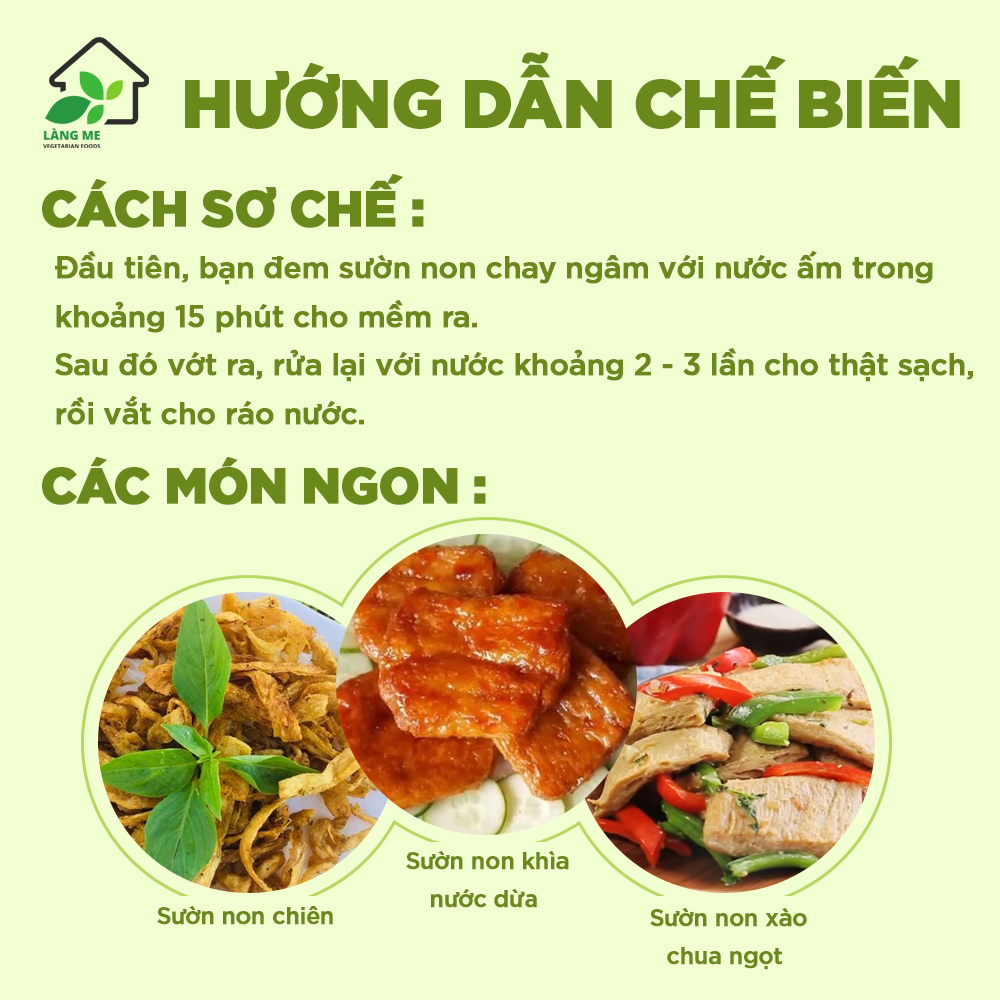 Sườn Chay Loại Ngon Thành Phần Tự Nhiên Không Chất Bảo Quản Không Biến Đổi Gen Sườn Non Chay Làng Me ( 1 Kg và 5 Kg )   Sản phẩm thực phẩm chay Làng Me cam kết: + Cam kết Chất Lượng Ngon - Dịch Vụ Hoàn Hảo + Giao nhanh chóng - Hỏa tốc 2h nội thành + Đóng gói cẩn thận bằng cả tấm lòng + Sản phẩm sản xuất mới , Thời hạn sử dụng dài + Cam kết đổi , hoàn trả hàng miễn phí nếu không hài lòng + Hàng ngon loại 1 , cam kết chất lượng Vệ Sinh An Toàn Thực Phẩm + Phản hồi , chăm sóc Khách Hàng 24/7 Thành phần : + Thực phẩm chay Làng Me làm từ 100% đậu nành, nước, lúa mì, tinh bột bắp,.. + Không chất bảo quản + Không biến đổi gen (non GMO) Hướng dẫn chế biến : + Đầu tiên, bạn đem sườn non chay ngâm với nước ấm trong khoảng 15 phút cho mềm ra. + Sau đó vớt ra, rửa lại với nước khoảng 2 - 3 lần cho thật sạch rồi vắt cho ráo nước, bắt đầu chế biến Gợi ý một số món ăn với Sườn non chay : + Sườn non chay chiên + Sườn non chay khìa nước dừa + Sườn non chay xào chua ngọt