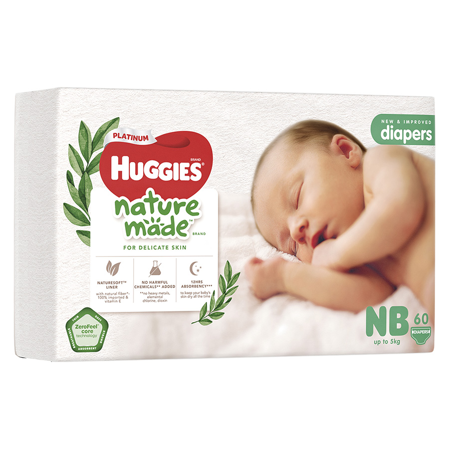 - Tã dán cao cấp Huggies Platinum Nature Made size NB (dưới 5kg): 60 miếng/túi