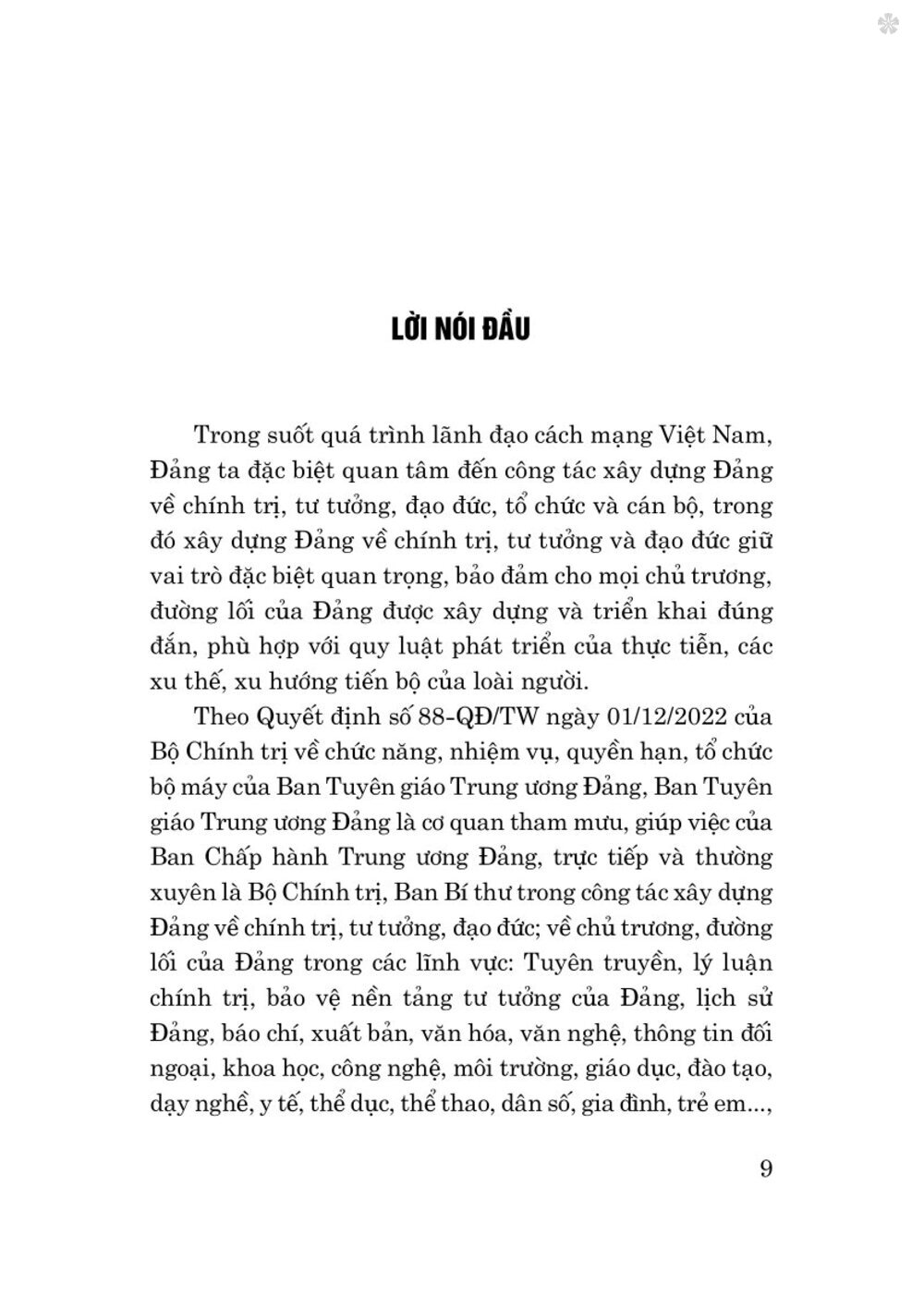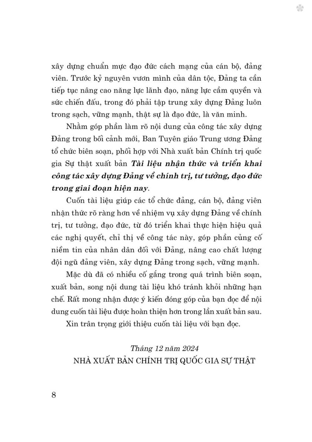 Nhằm góp phần làm rõ nội dung của công tác xây dựng Đảng trong bối cảnh mới, Ban Tuyên giáo Trung ương Đảng tổ chức biên soạn, phối hợp với Nhà xuất bản Chính trị quốc gia Sự thật xuất bảnTài liệu nhận thức và triển khai công tác xây dựng Đảng về chính trị, tư tưởng, đạo đức trong giai đoạn hiện nay. Cuốn tài liệu giúp các tổ chức đảng, cán bộ, đảng viên nhận thức rõ ràng hơn về nhiệm vụ xây dựng Đảng về chính trị, tư tưởng, đạo đức, từ đó triển khai thực hiện hiệu quả các nghị quyết, chỉ thị về công tác này, góp phần củng cố niềm tin của nhân dân đối với Đảng, nâng cao chất lượng đội ngũ đảng viên, xây dựng Đảng trong sạch, vững mạnh. Mặc dù đã có nhiều cố gắng trong quá trình biên soạn, xuất bản, song nội dung tài liệu khó tránh khỏi những hạn chế. Rất mong nhận được ý kiến đóng góp của bạn đọc để nội dung cuốn tài liệu được hoàn thiện hơn trong lần xuất bản sau. Xin trân trọng giới thiệu cuốn tài liệu với bạn đọc.