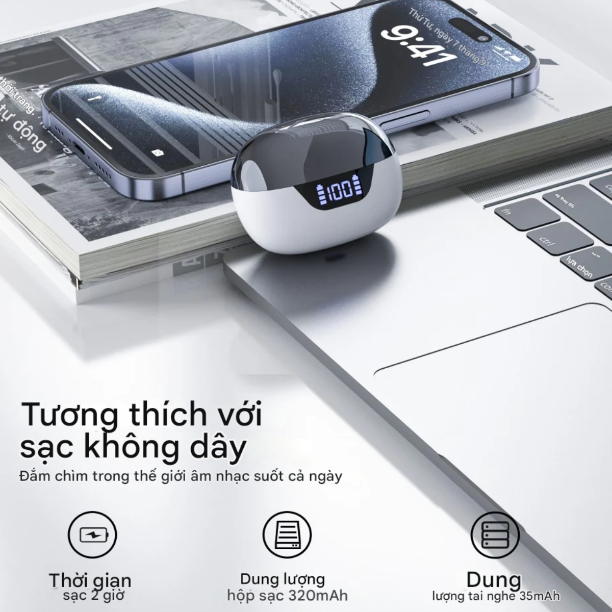 - Đóng gói: Hộp 1 sản phẩm, 1 cáp sạc USB A to Type C và hướng dẫn sử dụng Thông tin chi tiết – Với công nghệ chống ồn kép ENC + ANC tận hưởng không gian riêng đúng nghĩa. BH-T60 tích hợp cả ANC (Active Noise Cancellation) loại bỏ tiếng ồn môi trường xung quanh khi nghe nhạc và ENC (Environmental Noise Cancellation) khử nhiễu cho đàm thoại rõ ràng hơn khi gọi điện. Bạn có thể tập trung tuyệt đối khi làm việc, thư giãn trọn vẹn khi nghe nhạc, hoặc thực hiện cuộc gọi dù đang ở nơi đông người. – Trang bị màng loa chất lượng cao, tai nghe tái tạo âm thanh trung thực, dải bass sâu và âm mid – treble rõ ràng. Dù là bản nhạc nhẹ, EDM bùng nổ hay âm thanh hội thoại, mọi thứ đều trở nên sắc nét và lôi cuốn. – Được sử dụng công nghệ Bluetooth 5.3, cung cấp kết nối ổn định và nhanh chóng đến thiết bị của bạn, đồng thời giảm thiểu độ trễ và nhiễu. Với phiên bản Bluetooth tiên tiến này, bạn có thể tận hưởng chất lượng âm thanh tốt hơn và mức tiêu thụ điện năng thấp hơn, giúp việc sử dụng tai nghe Choetech BH-T60 trở nên thuận tiện hơn. – Với pin dung lượng lớn 35 mAh ở mỗi bên tai nghe, BH-T60 cung cấp thời gian phát nhạc hoặc gọi điện liên tục lên đến 6 giờ. Ngoài ra, hộp sạc với dung lượng 320 mAh còn có thể sạc không dây. Cung cấp thêm chu kỳ sạc, giúp bạn có thể sử dụng tai nghe cả ngày mà không cần phải sạc lại thường xuyên. – Thêm 1 điểm đặc biệt nữa trên hộp sạc của tai nghe Choetech BH-T60 có màn hình kỹ thuật số dễ đọc, giúp bạn biết được mức sạc của cả tai nghe và hộp sạc. Bằng cách này, bạn luôn biết mình có bao nhiêu năng lượng, loại bỏ nguy cơ hết pin bất ngờ vào thời điểm không mong muốn nhất. Hình ảnh Tai nghe không dây chống ồn kép ENC+ANC Choetech BH-T60 có màn hình LED hiển thị pin
