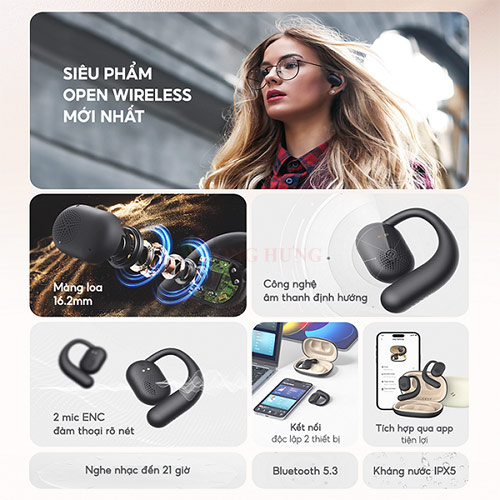 - Kiểu dáng Open-ear, thoải mái, tiện lợi, màu sắc đa dạng, thời trang