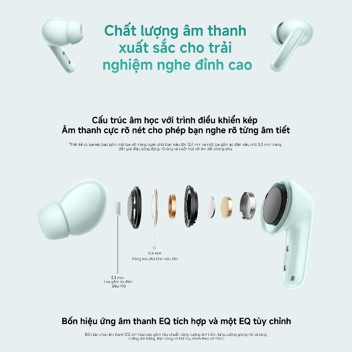 Mua tại TiktokRedmi Buds 6 sử dụng kiến trúc âm thanh kép hàng đầu, có nghĩa là nó có thể cung cấp âm bổng rõ ràng và trong trẻo hơn cũng như âm trầm phong phú hơn. Cụ thể, nó sử dụng bộ màng mạ titan siêu lớn 12.4mm và bộ gốm áp điện siêu nhỏ 5.5mm, bổ sung cho nhau, sống động, rõ ràng và kỹ lưỡng, đồng thời mang lại hiệu suất chi tiết, phong phú.