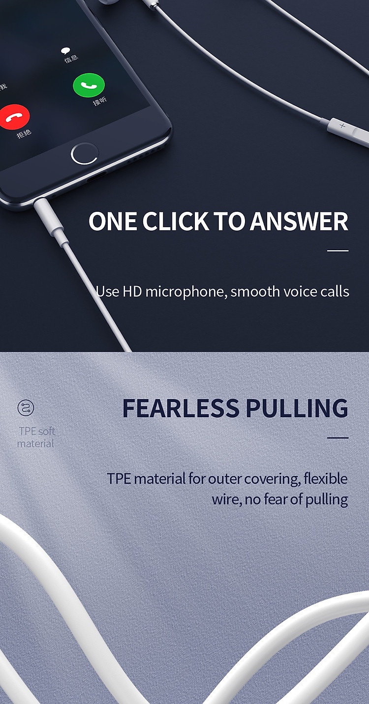 1. Certifying MFi chip 2. Compatible with all iOS moblie 3. Button to take/reject calls, adjust volume, change song, pause the music, wake up Siri 4. Material: TPE 5.Type: Lightning 6.Color: Black