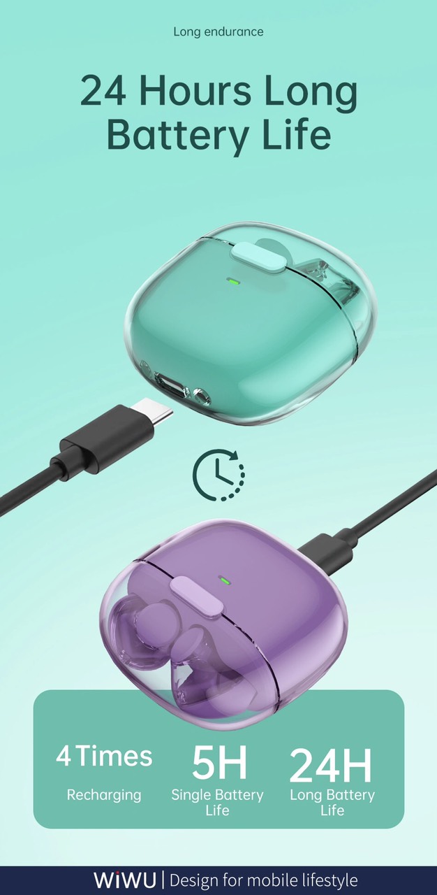 Tai nghe Wiwu ZERO BEANS T15 Thương hiệu: Wiwu Giao diện sạc: Type-C Phiên bản kết nối không dây: 5.3 Khoảng cách truyền: 10m Dung lượng pin tai nghe: 30mAh Thời gian nghe: khoảng 5