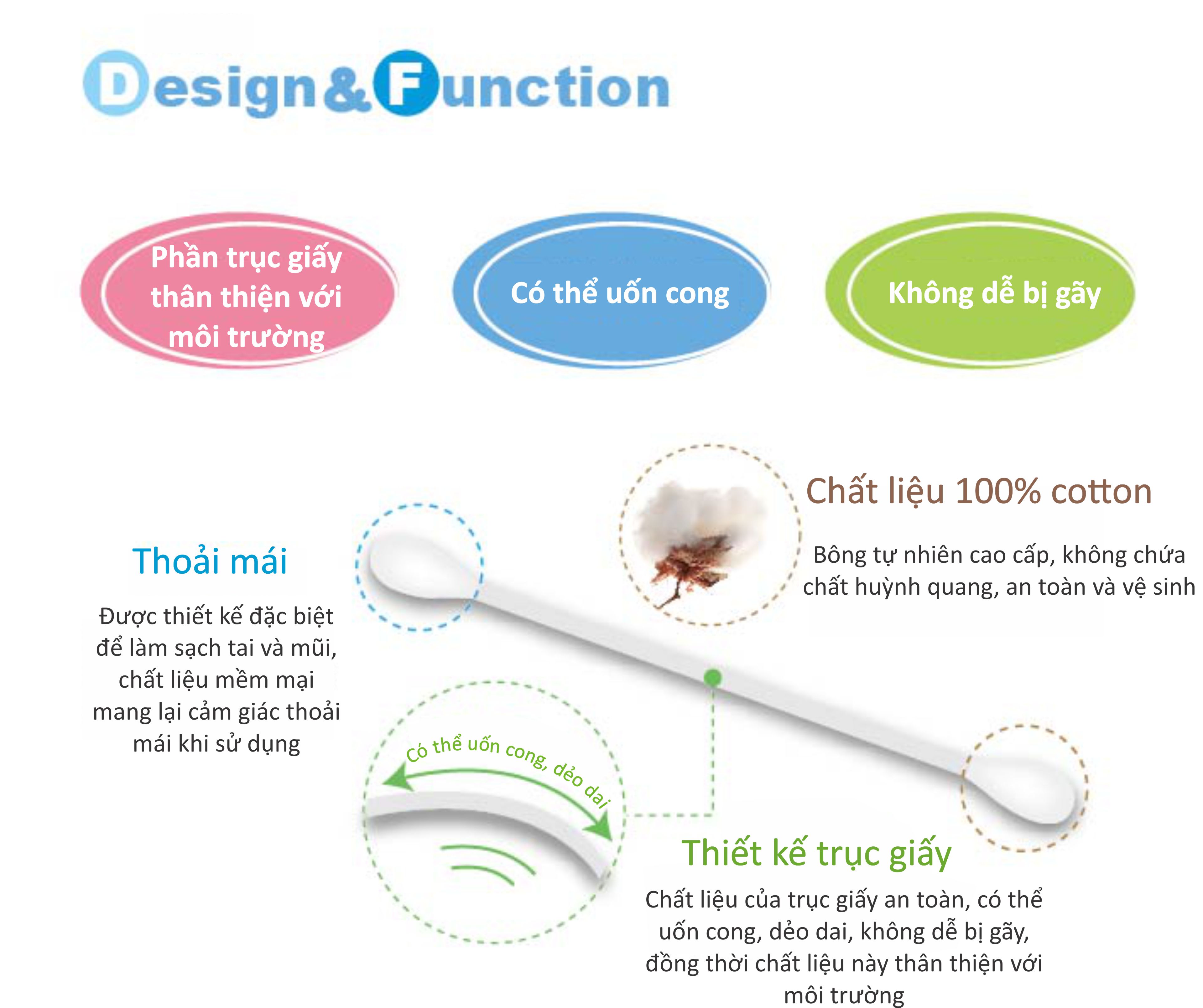 Đầu tăm được làm từ 100% bông chất lượng cao được sản xuất với công nghệ hiện đại, cho cảm giác mềm mại, không gây khô ráp khi chạm vào da hay vùng nhạy cảm của