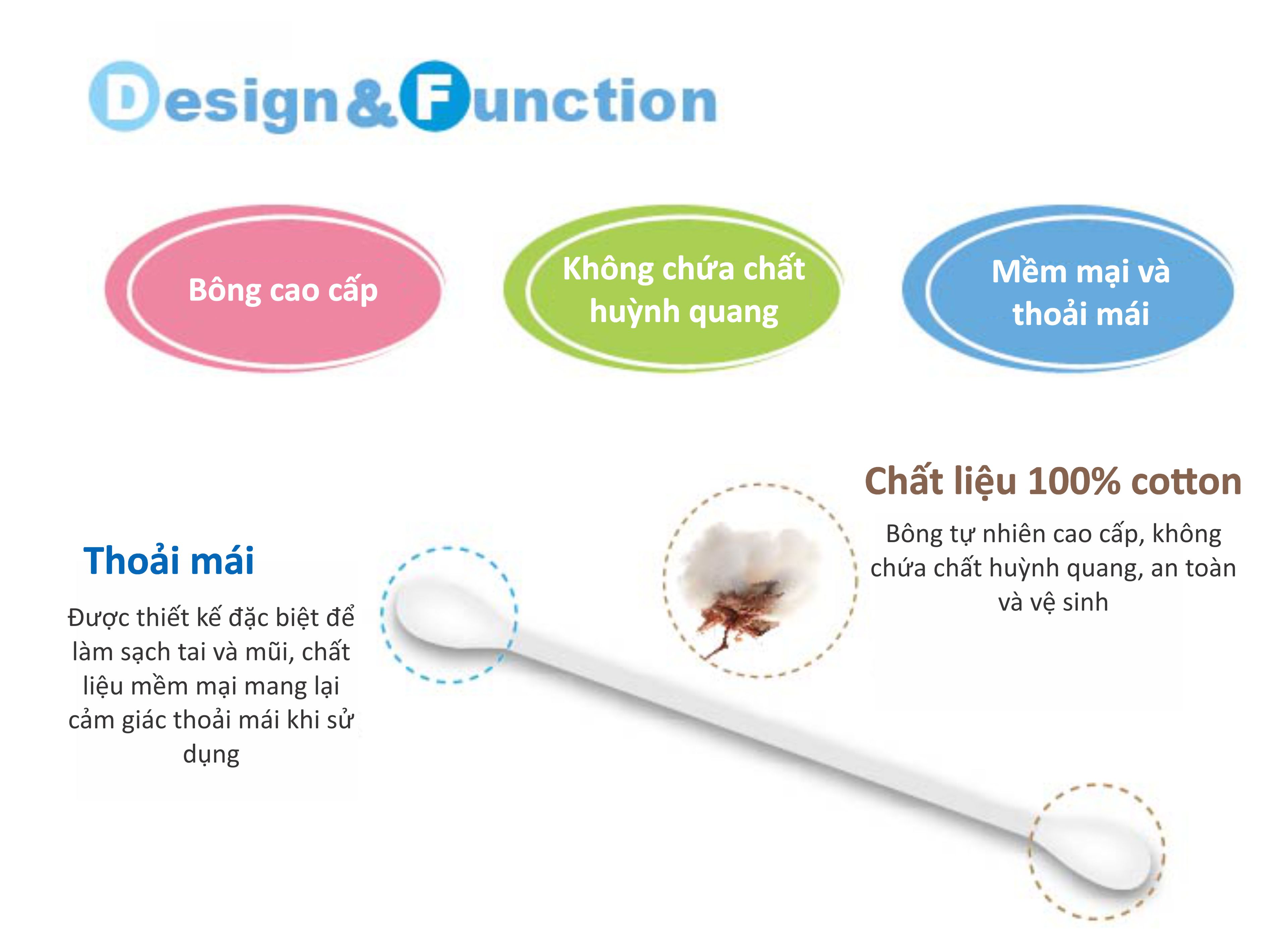 - Thiết kế nhỏ làm sạch sâu, sử dụng vô cùng dễ dàng, tiện lợi. Thành phần:bông cotton, thân nhựa. Số lượng: 260 cái Tuổi sử dụng: Dành cho bé từ 0 tuổi. HSD: 5 năm kể từ ngày sản xuất. Xuất xứ: Đài Loan