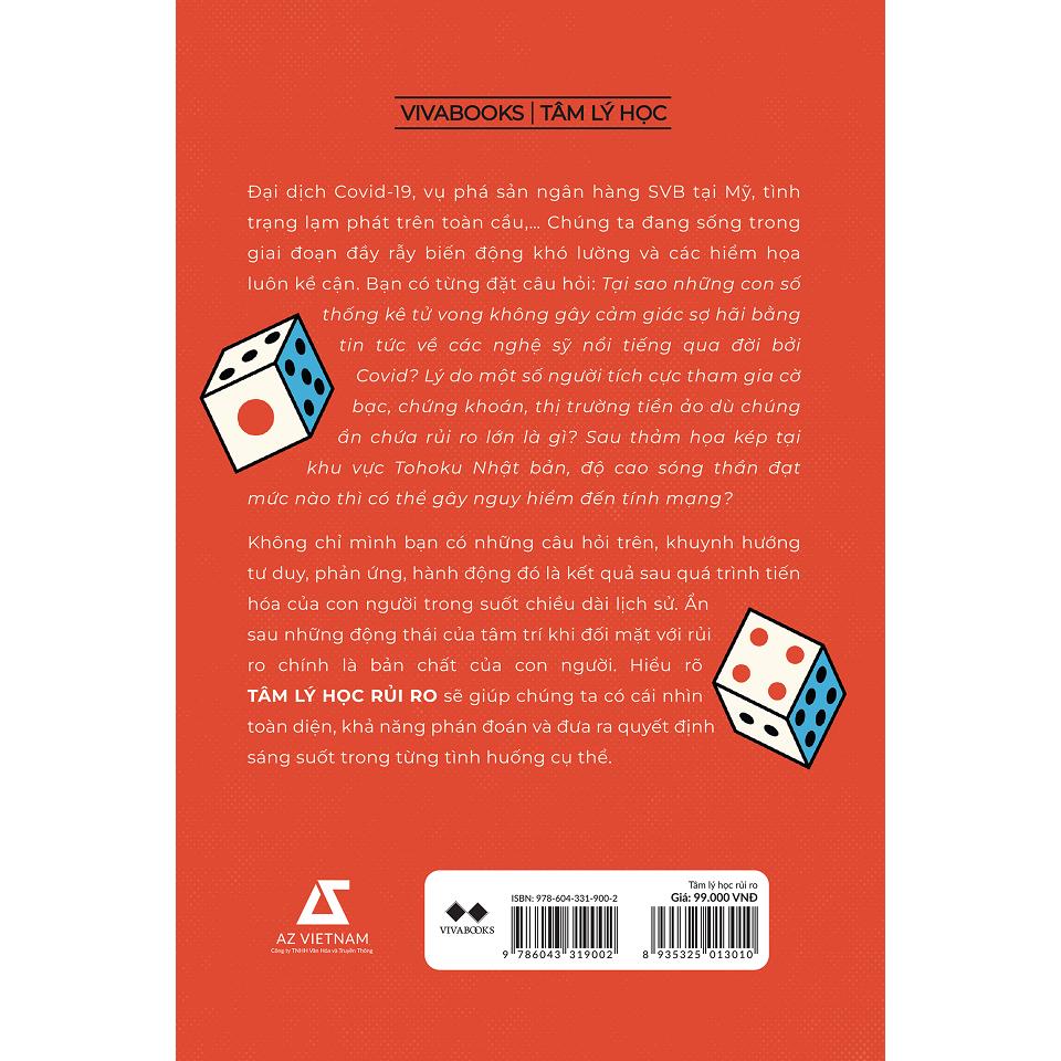 - * Giới thiệu sách Đại dịch Covid-19, vụ phá sản ngân hàng SVB tại Mỹ, tình trạng lạm phát trên toàn cầu, Chúng ta đang sống trong giai đoạn đầy rẫy biến động khó lường và các hiểm họa luôn kề cận. Bạn có từng đặt câu hỏi: Tại sao những con số thống kê tử vong không gây cảm giác sợ hãi bằng tin tức về các nghệ sỹ nổi tiếng qua đời bởi Covid? Lý do một số người tích cực tham gia cờ bạc, chứng khoán, thị trường tiền ảo dù chúng ẩn chứa rủi ro lớn là gì? Sau thảm họa kép tại khu vực Tohoku Nhật bản, độ cao sóng thần đạt mức nào thì có thể gây nguy hiểm đến tính mạng? Không chỉ mình bạn có những câu hỏi trên, khuynh hướng tư duy, phản ứng, hành động đó là kết quả sau quá trình tiến hóa của con người trong suốt chiều dài lịch sử. Ẩn sau những động thái của tâm trí khi đối mặt với rủi ro chính là bản chất của con người. Hiểu rõ TÂM LÝ HỌC RỦI RO sẽ giúp chúng ta có cái nhìn toàn diện, khả năng phán đoán và đưa ra quyết định sáng suốt trong từng tình huống cụ thể.
