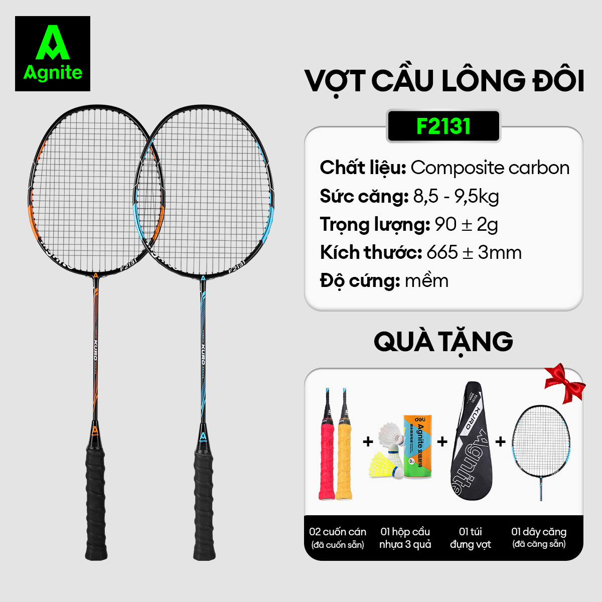 THÔNG SỐ CƠ BẢN Thương hiệu: Agnite Mã số: F2108 Số lượng: Hai chiếc Màu sắc: xanh lam + đỏ Trọng lượng vợt: 110 ± 5g Độ cứng thanh: cứng Lực căng dây: 16-18LB Chiều