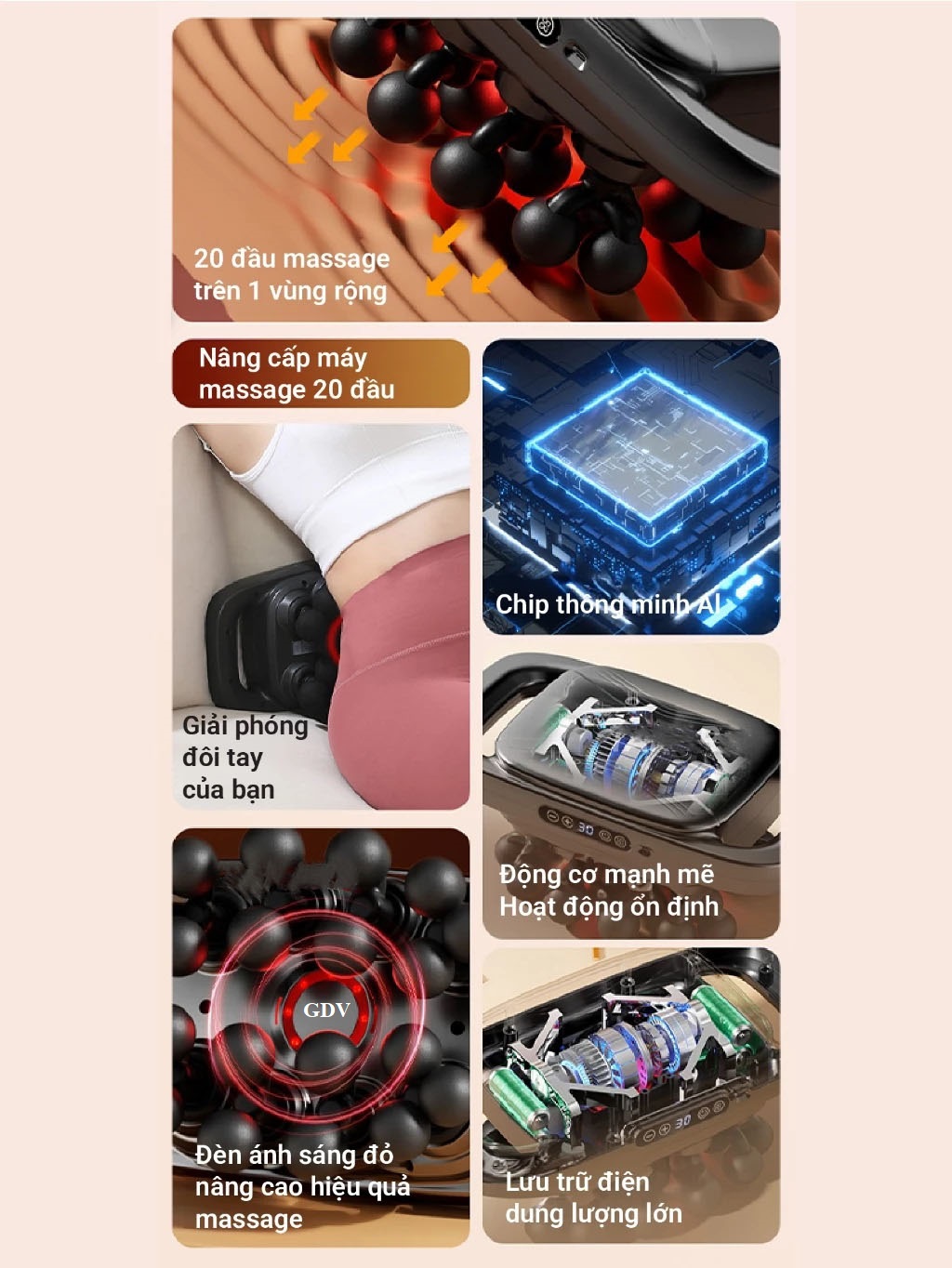 1.THÔNG TIN SẢN PHẨM: - Tên sản phẩm: Máy massage 20 đầu GDV S3C-20 - Kích thước sản phẩm: 17.5 x 14.4 x 35cm - Dung lượng pin: 2000mAh - Chức năng: 9 chế độ,