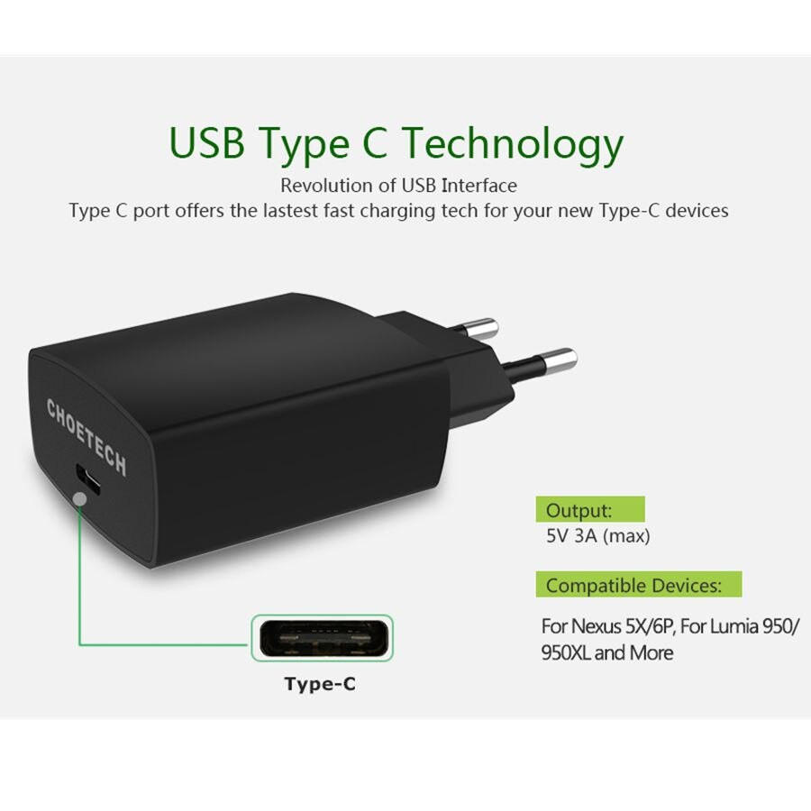 (Tặng kèm 1 dây sạc nhanh Type-C) Bộ cóc củ sạc nhanh 15W chuẩn PD 3.0 Type-C hiệu CHOETECH TC0001 cho điện thoại / máy tính bảng / Macbook iPhone Samsung Huawei Xiaomi Oppo Nokia Trang bị chip sạc thông minh