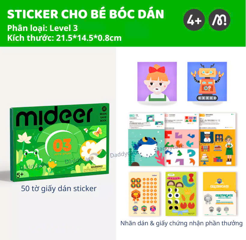 Level 3 ( 5+ )- cao cấp: gồm 50pcs khác nhau, 1 nhãn dán, 1 giấy chứng nhận thành tích, 1 dải băng keo 2 mặt