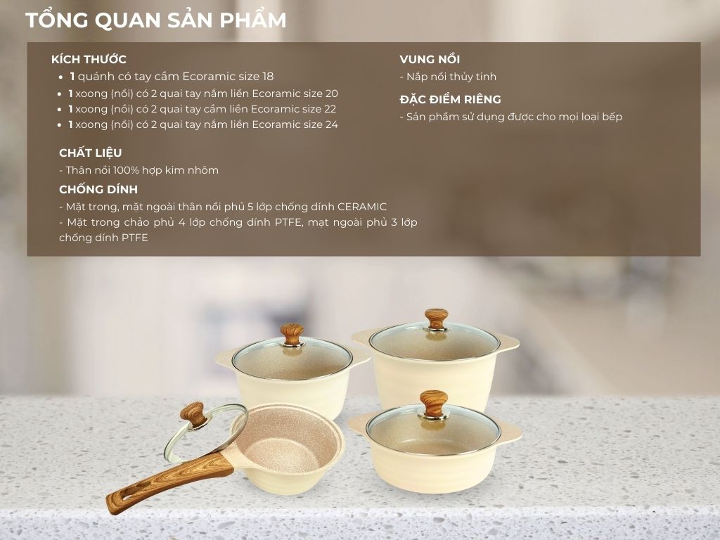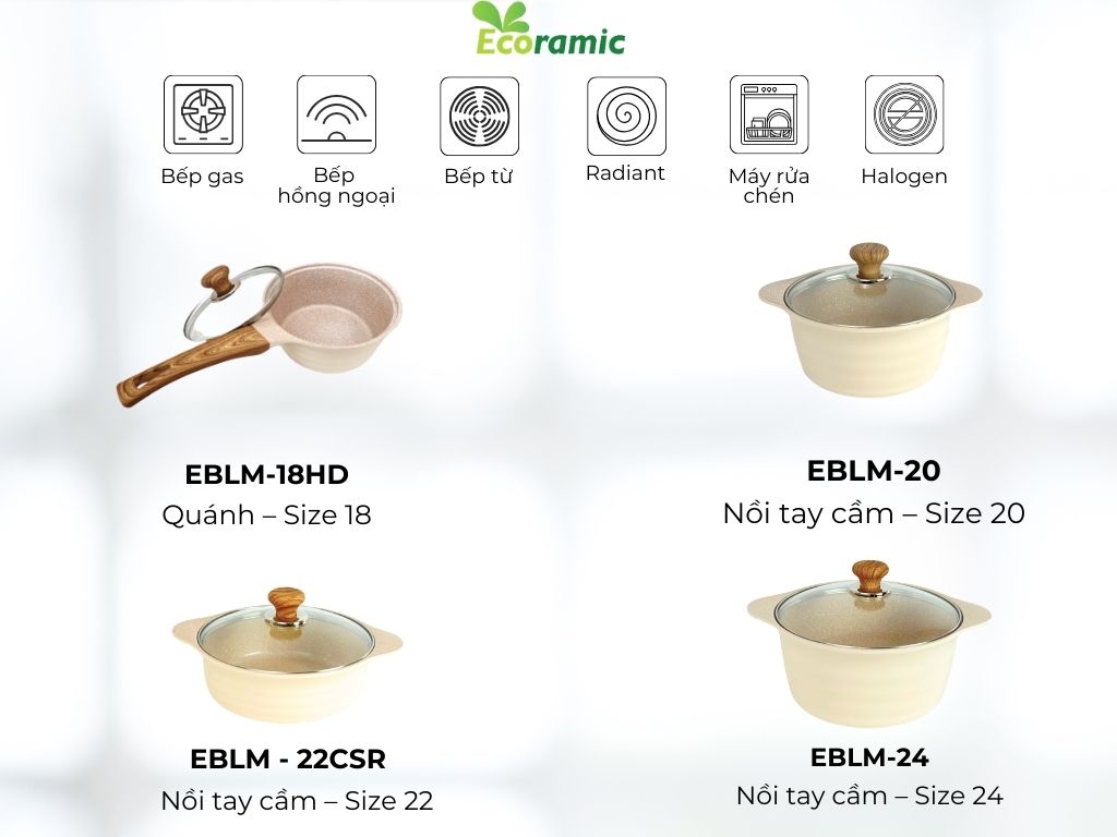 Bộ 4 nồi ECORAMIC bao gồm Nồi chảo với các kích thước phù hợp nhu cầu sử dụng của gia đình: Nồi 20cm; Nồi 24cm; Chảo sâu 20cm; Chảo cạn 24cm