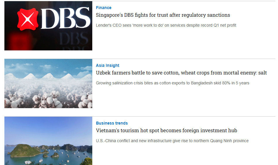 Nikkei Asia là tạp chí tiếng Anh có tên tuổi thuộc tập đoàn Nikkei - Nhật Bản, chuyên viết về những xu hướng kinh tế, công nghệ, chính trị của các nước trong khu vực châu Á - Thái Bình Dương gồm có Việt Nam. Ngoài ra còn cung cấp các phân tích từ chuyên gia, nhà báo về đời sống và văn hóa các nước châu Á. (Trending, Business, Markets,Tech, Politics, Economy, Features, Opinion, Life & Arts).