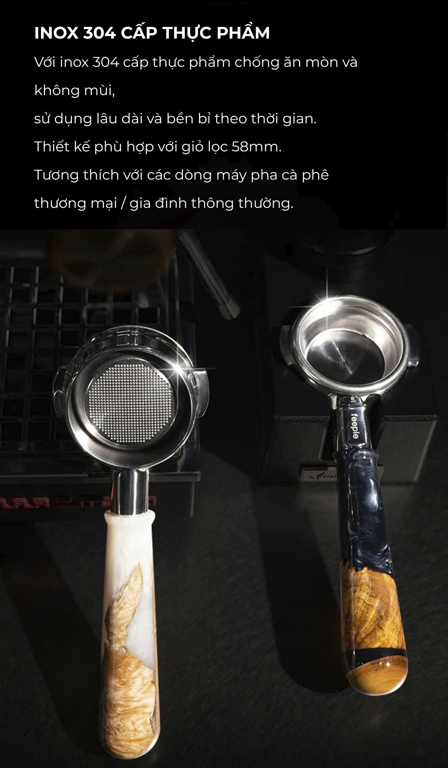 TAY CẦM ESPRESSO KHÔNG ĐÁY VÂN GỖ TỰ NHIÊN FEEPIE Sự kết hợp tuyệt vời giữa gỗ óc chó và nhựa cao cấp mang đến cho bạn trải nghiệm pha chế espresso đẳng cấp. Tay