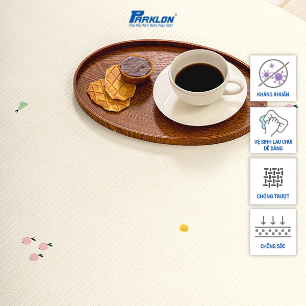 Mua tại TiktokThảm Trẻ Em Hàng Đầu Thế Giới Nhập Khẩu Chính Hãng Hàn Quốc Parklon Thương hiệu: Parklon Xuất xứ: Hàn Quốc Chất liệu: Nhựa PVC Họa tiết: Trái cây cao cấp Kích thước: 210cm x 140cm x 1.5cm Độ bền: 10 năm THẢM TRẺ EM HÀNG ĐẦU THẾ GIỚI CHÍNH HÃNG PARKLON: Bảo vệ con bạn khỏi sàn nhà cứng khi các bé tập bò, tập đứng hay tập đi. Thảm trẻ em Parklon được thiết kế đặc biệt để hấp thụ tác động và mang lại sự thoải mái hàng giờ cho các bé. ★ Chất liệu cao cấp được nhập khẩu từ Đức, kết hợp với công nghệ tiên tiến nhất của Parklon để tạo nên những chiếc thảm trẻ em hoàn hảo nhất. ★ Công nghệ chống sốc, chống va đập và giảm tiếng ồn được cải tiến giúp trẻ thoải mái vui chơi. ★ Thiết kế 2 mặt với hoa văn đặc biệt chống trơn trượt và công nghệ bo góc đặc biệt không gây nguy hiểm cho bé. ★ Công nghệ Nano kháng khuẩn quanh năm, không gây dị ứng, an toàn ngay cả với làn da của trẻ sơ sinh. ★ Khả năng chống nước 100% và dễ dàng vệ sinh, chỉ cần lau sạch vết bẩn bằng khăn. ★ Bề mặt thảm mềm mại, êm ái kết hợp cùng chất liệu đặc biệt giúp giữ ấm vào mùa đông, không nóng vào mùa hè. ★ Chất liệu thân thiện với môi trường, không chứa các chất độc hại và kim loại nặng. ★ Đạt chứng nhận an toàn từ tổ chức toàn cầu: KC, SGS, ISO 9001, An toàn Châu Âu EN71