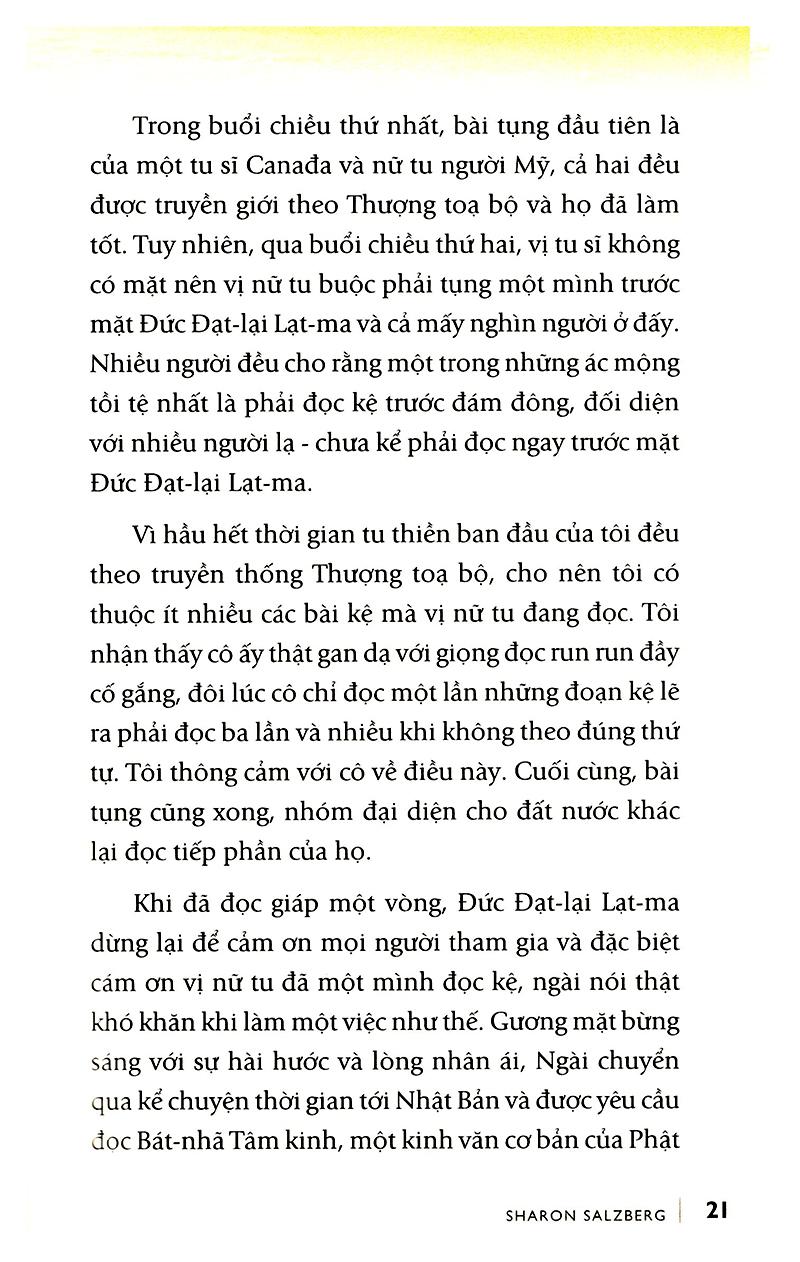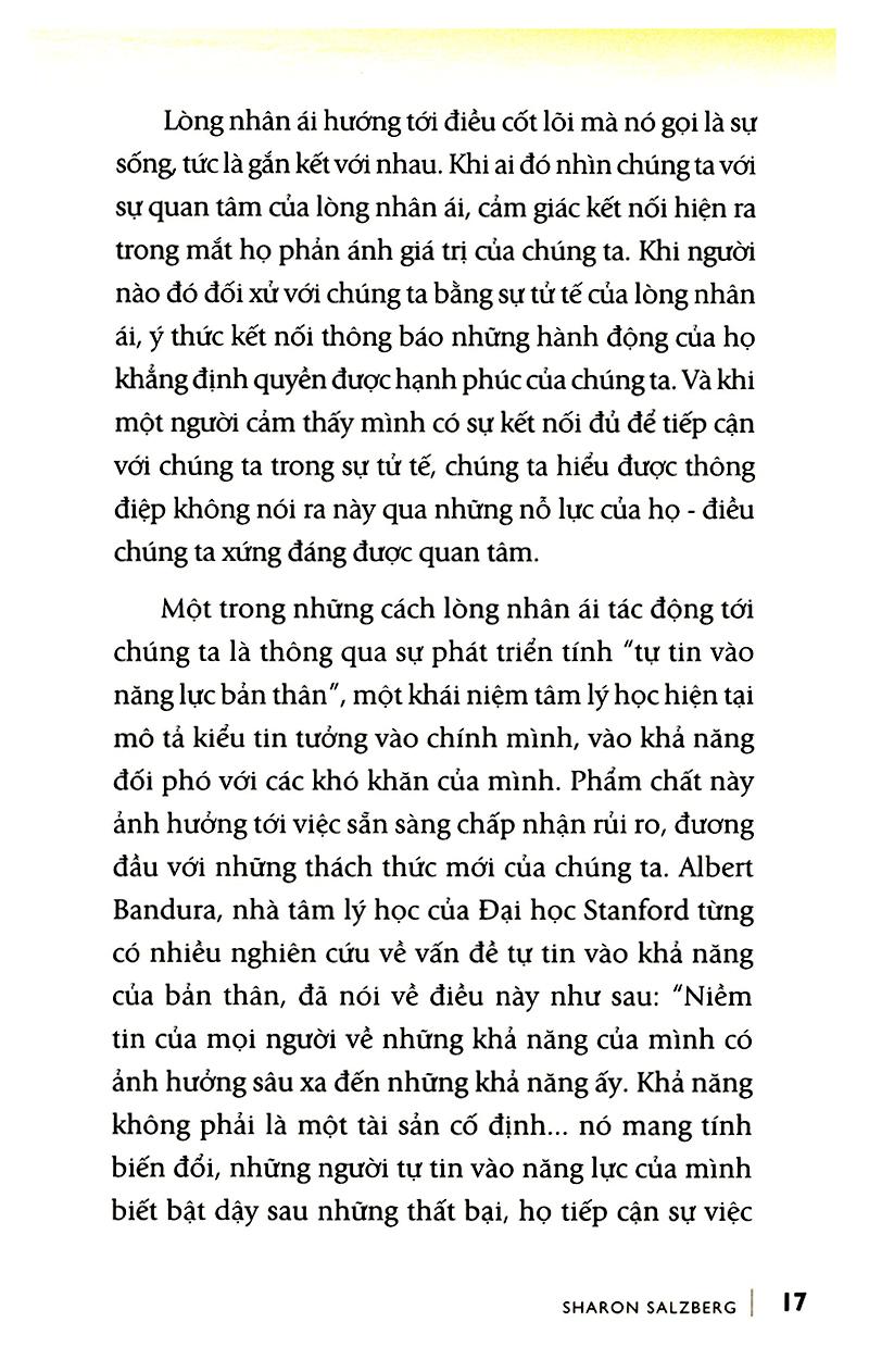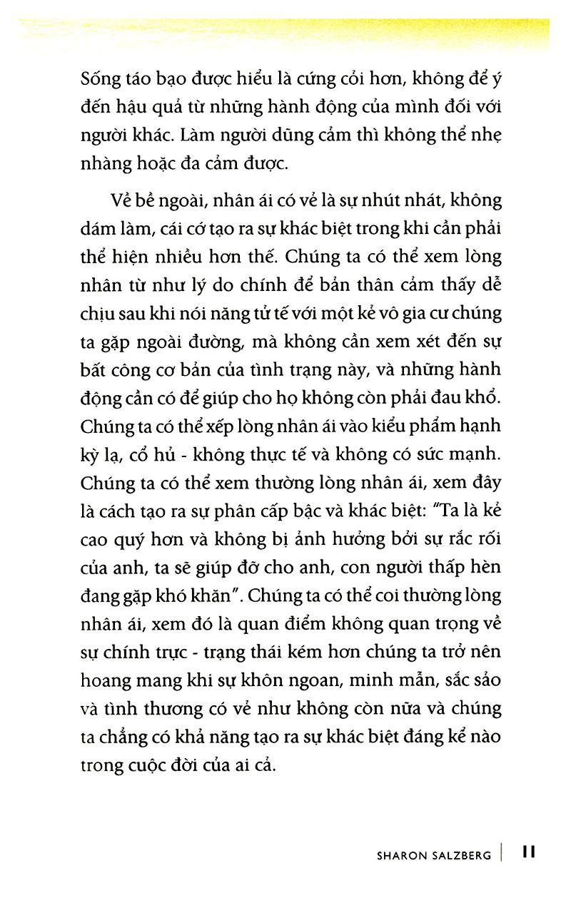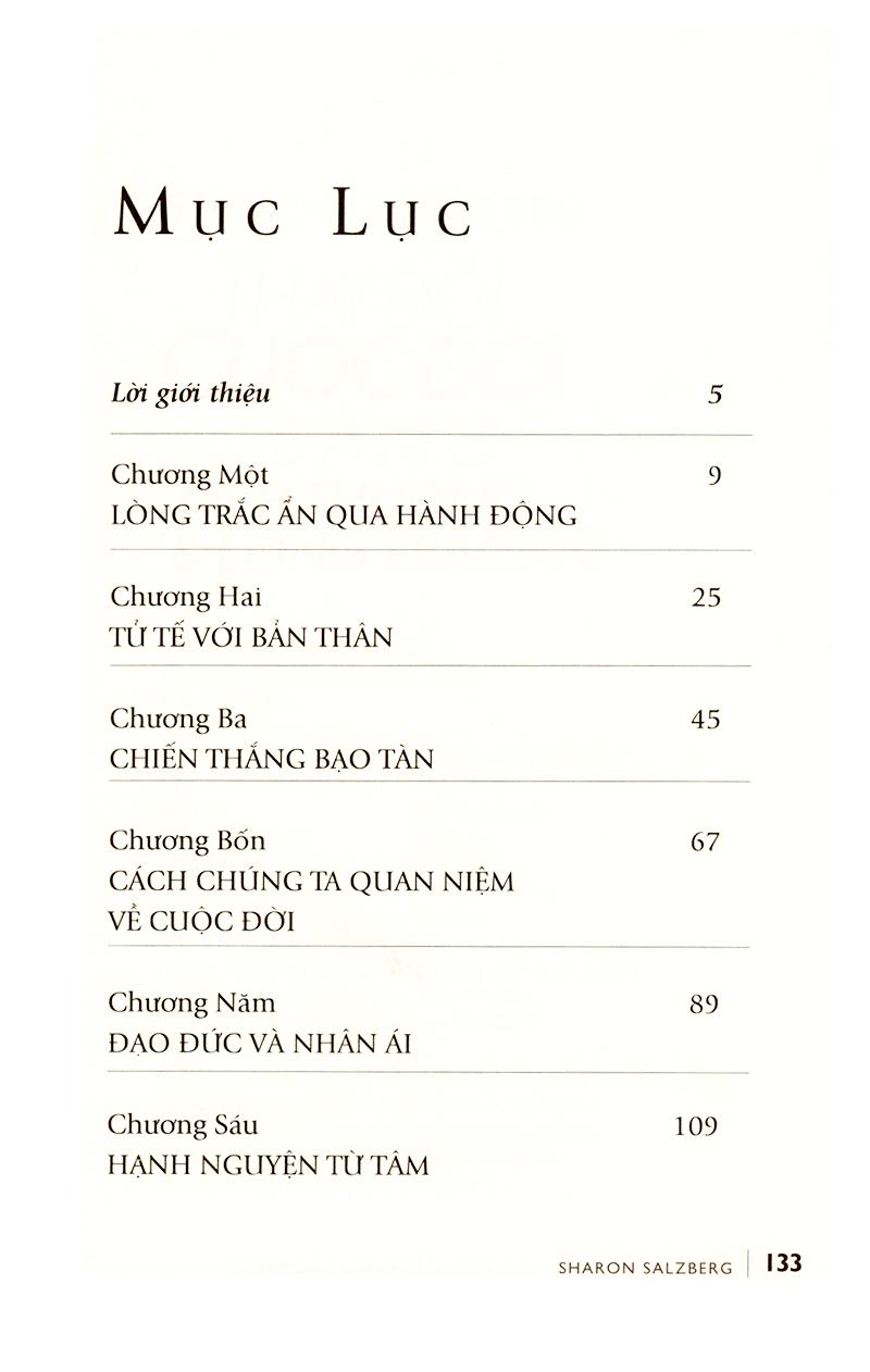 Điều gì sẽ xảy ra nếu lòng tốt và sự bao dung là kỹ năng tiềm ẩn mà bạn có thể phát triển? Với sách Thay đổi cuộc đời bằng tình thương và lòng trắc ẩn, Sharon Salzberg hướng dẫn độc giả trải nghiệm quá trình khám phá sức mạnh đích thực của lòng nhân ái và sử dụng nó làm hướng đi cho cuộc sống hàng ngày. Qua sách những câu chuyện mang tính giáo huấn, những hiểu biết sâu sắc từ những năm tháng làm chuyên gia hướng dẫn thiền định của Sharon và qua những bài tập thực hành, bạn sẽ học được cách nuôi dưỡng sự thanh thản, mở rộng trái tim đồng cảm và thể hiện sức mạnh của tình yêu thương tới mọi người.