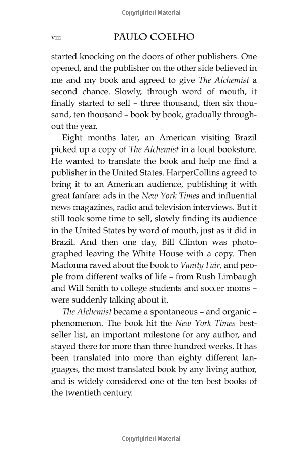 Paulo Coelho's masterpiece tells the mystical story of Santiago, an Andalusian shepherd boy who yearns to travel in search of a worldly treasure. His quest will lead him to riches far different—and far more satisfying—than he ever imagined. Santiago's journey teaches us about the essential wisdom of listening to our hearts, of recognizing opportunity and learning to read the omens strewn along life's path, and, most importantly, to follow our dreams.