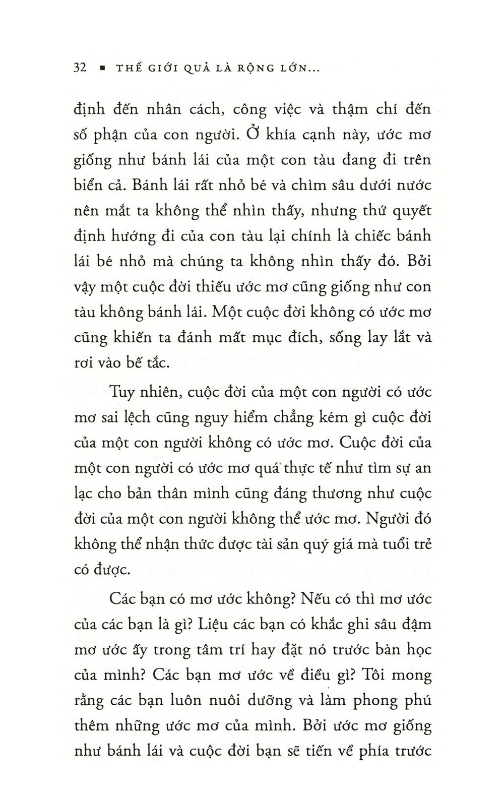 Tuổi trẻ rất cần phải biết sống ước mơ, tuổi trẻ chính là ước mơ và lịch sử thuộc về những người biết ước mơ. Đó chính là chìa khóa đưa bạn đến với những trải ngiệm, những con đường thành công phía trước. Cuốn sách Thế Giới Quả Là Rộng Lớn Và Có Rất Nhiều Việc Phải Làm sẽ là cánh cổng mở ra cho bạn một Thế Giới rộng lớn.
