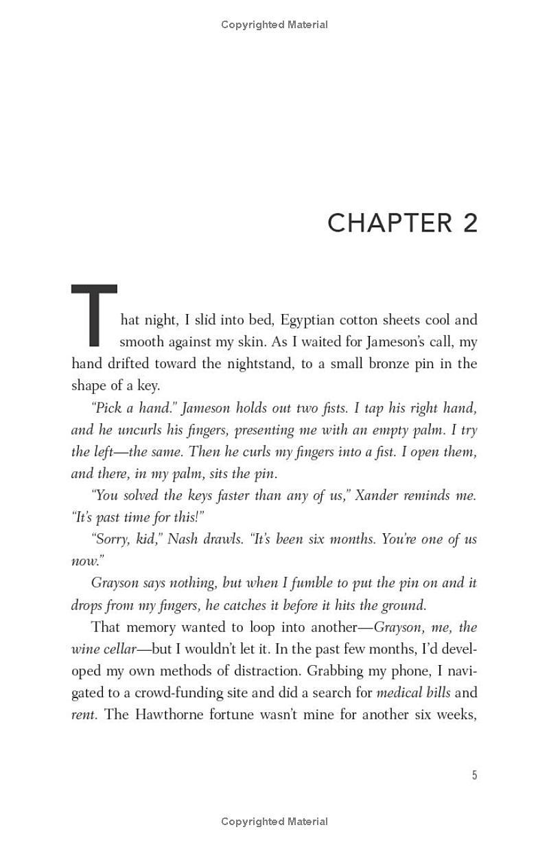Against all odds, Avery has survived nearly a year of secrets, schemes, and love lost and found at Hawthorne House. She's weeks away from fulfilling the terms of Tobias Hawthorne's will and inheriting his billions.