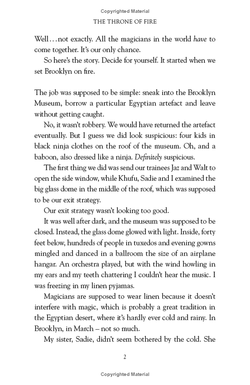 If Carter and Sadie don't destroy him, the world will end in five days' time. And in order to battle the forces of chaos, they must revive the sun god Ra - a feat no magician has ever achieved. Because first they must search the world for the three sections of the Book of Ra, then they have to learn how to chant its spells . . .