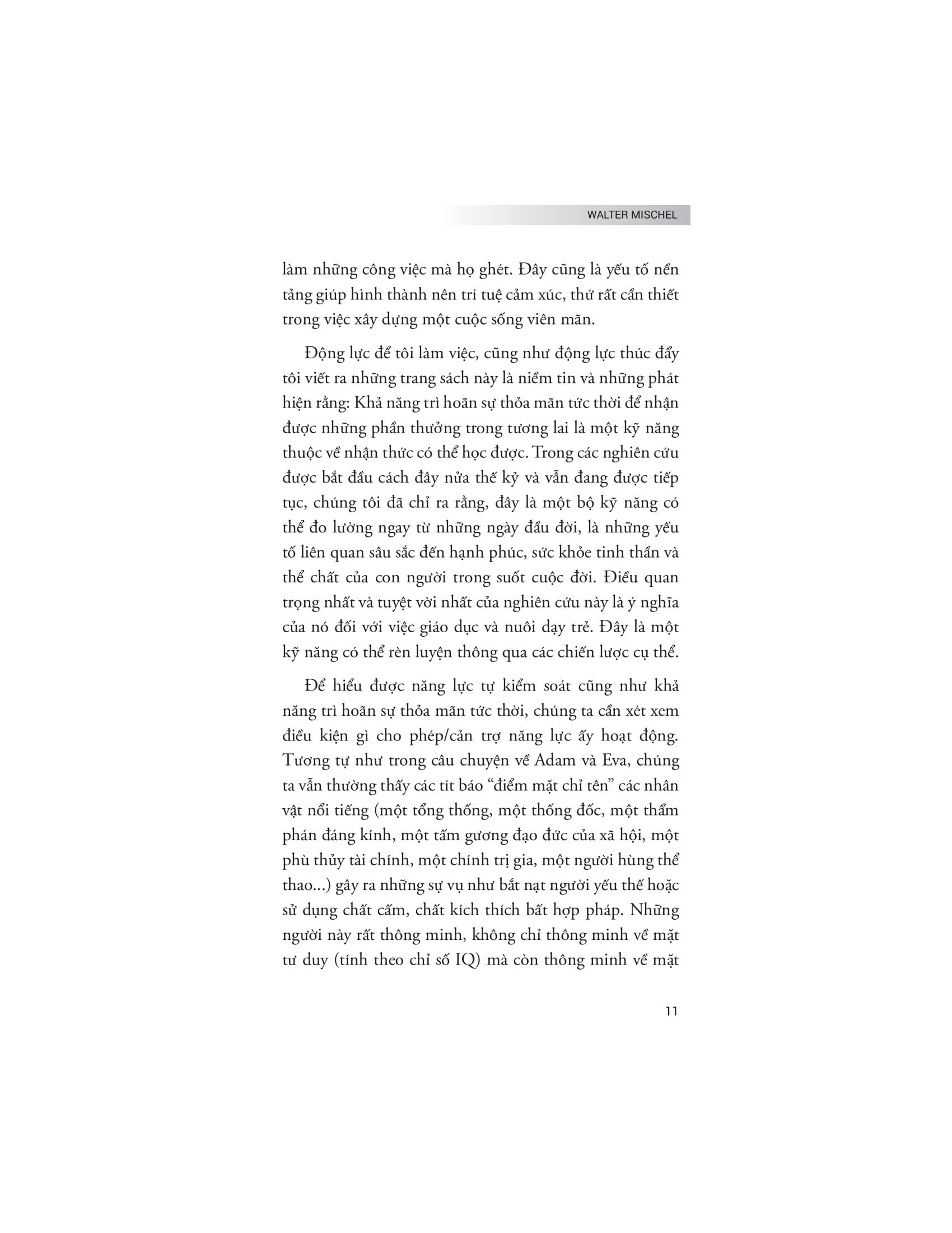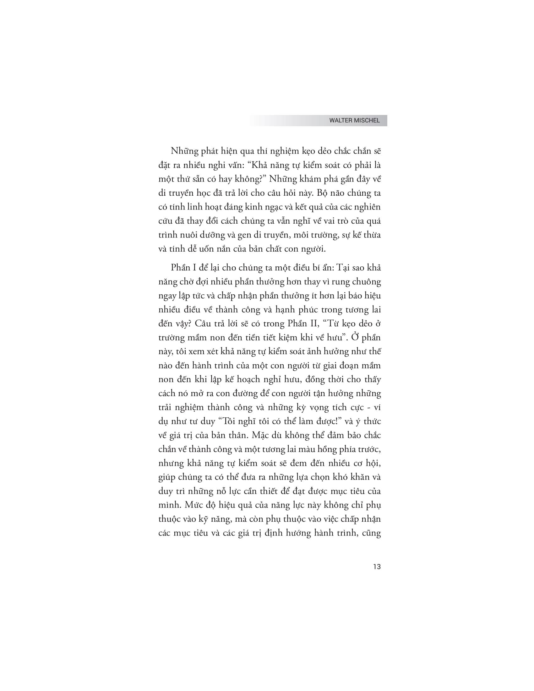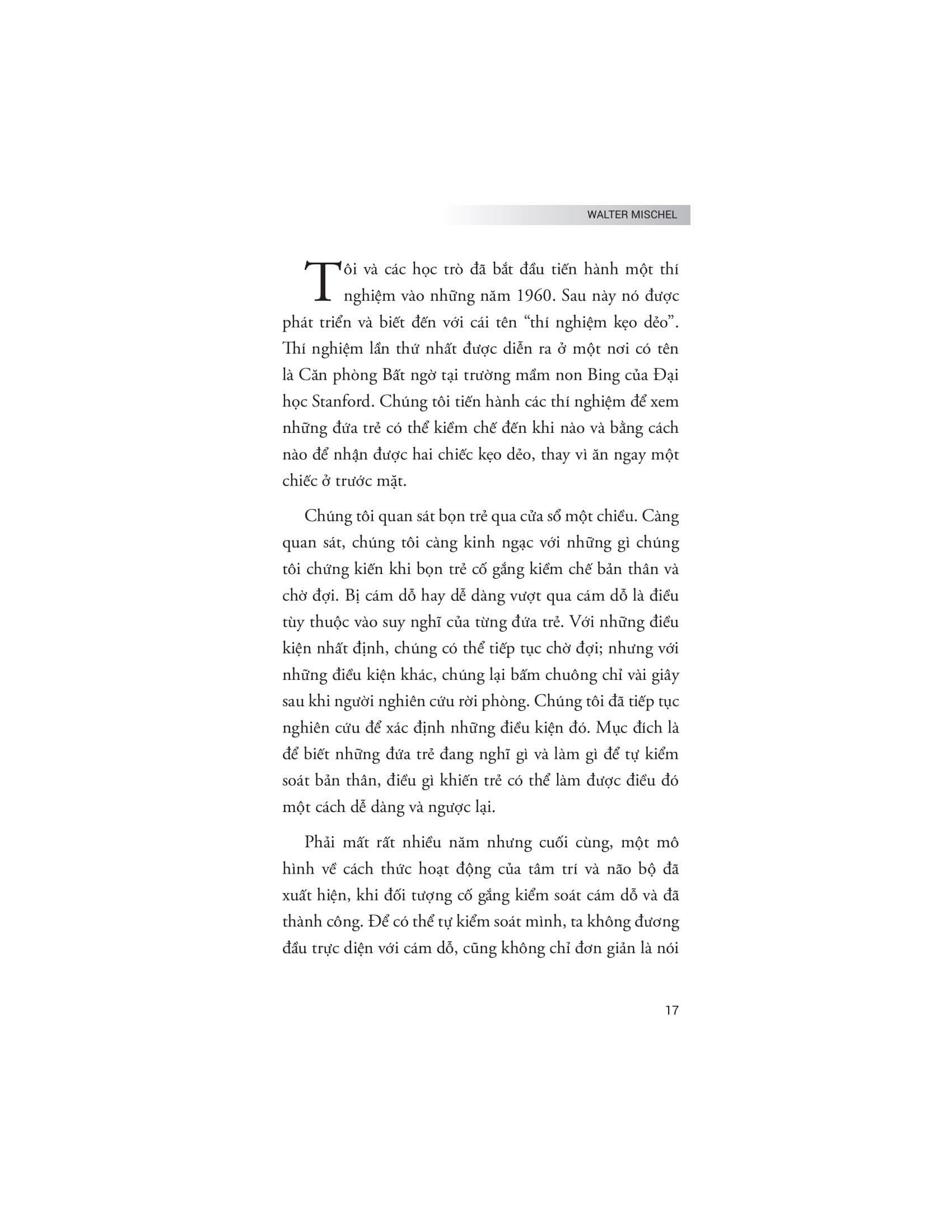 The Marshmallow Test - Hiệu Ứng Của Sự Cám Dỗ Và Khai Phá Sức Mạnh Của Ý Chí Tự Chủ Để Kiểm Soát Bản Năng Cuốn sách The Marshmallow Test của Walter Mischel là một tác phẩm nổi tiếng trong lĩnh vực tâm lý học, tập trung vào việc khám phá và nâng cao khả năng tự kiểm soát, một yếu tố quan trọng giúp cá nhân đạt được thành công và hạnh phúc trong cuộc sống. Dựa trên thí nghiệm kinh điển "Bài kiểm tra kẹo dẻo" (Marshmallow Test), cuốn sách không chỉ phân tích mối liên hệ giữa khả năng kiềm chế bản thân từ khi còn nhỏ và thành công trong cuộc sống sau này mà còn đưa ra những hướng dẫn thiết thực về cách cải thiện kỹ năng tự chủ này. Thí nghiệm Marshmallow Test, được Mischel và các cộng sự thực hiện vào những năm 1960, yêu cầu các em nhỏ phải chọn lựa giữa việc ăn ngay một viên kẹo dẻo hoặc chờ đợi một khoảng thời gian để nhận thêm một viên nữa. Kết quả của thí nghiệm cho thấy những em nhỏ có khả năng kiên nhẫn và chờ đợi lâu hơn (tức là có khả năng tự kiểm soát tốt hơn) thường có thành công vượt trội trong các lĩnh vực học tập, nghề nghiệp, và kỹ năng sống khi trưởng thành. Điều này cho thấy khả năng kiểm soát bản thân có thể dự báo nhiều yếu tố quyết định sự thành công lâu dài trong cuộc sống. Tác giả Walter Mischel đi sâu vào phân tích các chiến lược và phương pháp giúp cải thiện khả năng tự kiểm soát, từ việc xây dựng ý chí mạnh mẽ đến việc áp dụng các chiến lược tinh thần để đối phó với cám dỗ và duy trì kiên nhẫn. Bên cạnh đó, tác giả cũng chỉ ra những yếu tố ảnh hưởng đến ý chí và sự kiểm soát bản thân, từ môi trường, cách giáo dục đến các yếu tố tâm lý cá nhân. Bằng cách ứng dụng những bài học từ thí nghiệm kẹo dẻo vào cuộc sống thực tế, The Marshmallow Test không chỉ giúp người đọc hiểu rõ hơn về bản chất của tự kiểm soát mà còn cung cấp những cách thức và chiến lược hữu ích để rèn luyện khả năng này. Cuốn sách phân tích cách sự kiểm soát bản thân có thể ảnh hưởng đến nhiều khía cạnh trong cuộc sống, từ việc duy trì sức khỏe tốt, xây dựng sự nghiệp thành công đến phát triển các mối quan hệ cá nhân bền vững. Rất nhiều khía cạnh thú vị và ý nghĩa về năng lực tự chủ đã được các nhà nghiên cứu dày công tìm hiểu. Kết quả rút ra từ công trình này – sẽ giúp các bạn độc giả có một cái nhìn toàn cảnh và chuyên sâu về một trong những kỹ năng thiết yếu nhất của con người. Về tác giả Walter Mischel là nhà tâm lý học người Mỹ chuyên về lý thuyết nhân cách và tâm lý xã hội. Ông là giáo sư tại khoa Tâm lý học, Đại học Columbia. Năm 2007, Mischel được bầu làm chủ tịch Hiệp hội Khoa học Tâm lý. Ông là biên tập viên của tạp chí Psychological Review, đồng thời giữ chức chủ tịch của Hiệp hội Nghiên cứu Tính cách. Năm 2011, Mischel nhận Giải thưởng Grawemeyer về Tâm lý học của Đại học Louisville cho các nghiên cứu của ông về khả năng tự kiểm soát bản thân.