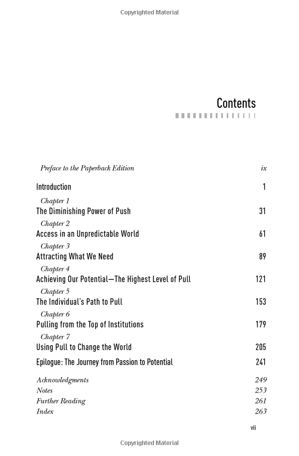 In a radical break with the past, information now flows like water, and we must learn how to tap into its stream. Individuals and companies can no longer rely on the stocks of knowledge that they've carefully built up and stored away. Information now flows like water, and we must learn how to tap into the stream. But many of us remain stuck in old practices- practices that could undermine us as we search for success and meaning. In this revolutionary book, three doyens of the Internet age, whose path-breaking work has made headlines around the world, reveal the adjustments we must make if we take these changes seriously. In a world of increasing risk and opportunity, we must understand the importance of pull . Understood and used properly, the power of pull can draw out the best in people and institutions by connecting them in ways that increase understanding and effectiveness. Pull can turn uncertainty into opportunity, and enable small moves to achieve outsized impact. Drawing on pioneering research, The Power of Pull shows how to apply its principles to unlock the hidden potential of individuals and organizations, and how to use it as a force for social change and the development of creative talent. The authors explore how to use the power of pull to: Access new sources of information Attract likeminded individuals from around the world Shape serendipity to increase the likelihood of positive chance encounters Form creation spaces to drive you and your colleagues to new heights Transform your organization to adapt to the flow of knowledge The Power of Pull is essential reading for entrepreneurs, managers, and anybody interested in understanding and harnessing the shifting forces of our networked world.