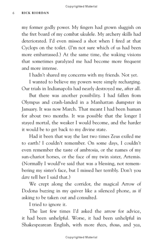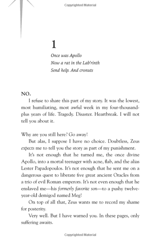 The formerly glorious god Apollo, cast down to earth in punishment by Zeus, is now an awkward mortal teenager named Lester Papadopoulos. In order to regain his place on Mount Olympus, Lester must restore five Oracles that have gone dark. But he has to achieve this impossible task without having any godly powers and while being duty-bound to a confounding young daughter of Demeter named Meg. Thanks a lot, Dad.