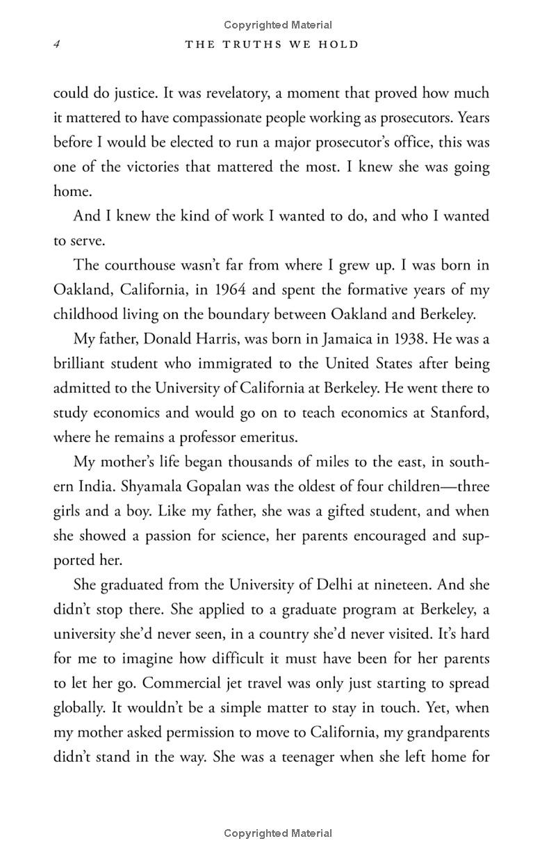 Vice President Kamala Harris's commitment to speaking truth is informed by her upbringing. The daughter of immigrants, she was raised in an Oakland, California community that cared deeply about social justice; her parents--an esteemed economist from Jamaica and an admired cancer researcher from India--met as activists in the civil rights movement when they were graduate students at Berkeley. Growing up, Harris herself never hid her passion for justice, and when she became a prosecutor out of law school, a deputy district attorney, she quickly established herself as one of the most innovative change agents in American law enforcement. She progressed rapidly to become the elected District Attorney for San Francisco, and then the chief law enforcement officer of the state of California as a whole. Known for bringing a voice to the voiceless, she took on the big banks during the foreclosure crisis, winning a historic settlement for California's working families. Her hallmarks were applying a holistic, data-driven approach to many of California's thorniest issues, always eschewing stale "tough on crime" rhetoric as presenting a series of false choices. Neither "tough" nor "soft" but smart on crime became her mantra. Being smart means learning the truths that can make us better as a community, and supporting those truths with all our might. That has been the pole star that guided Harris to a transformational career as the top law enforcement official in California, and it is guiding her now as a transformational United States Senator, grappling with an array of complex issues that affect her state, our country, and the world, from health care and the new economy to immigration, national security, the opioid crisis, and accelerating inequality.