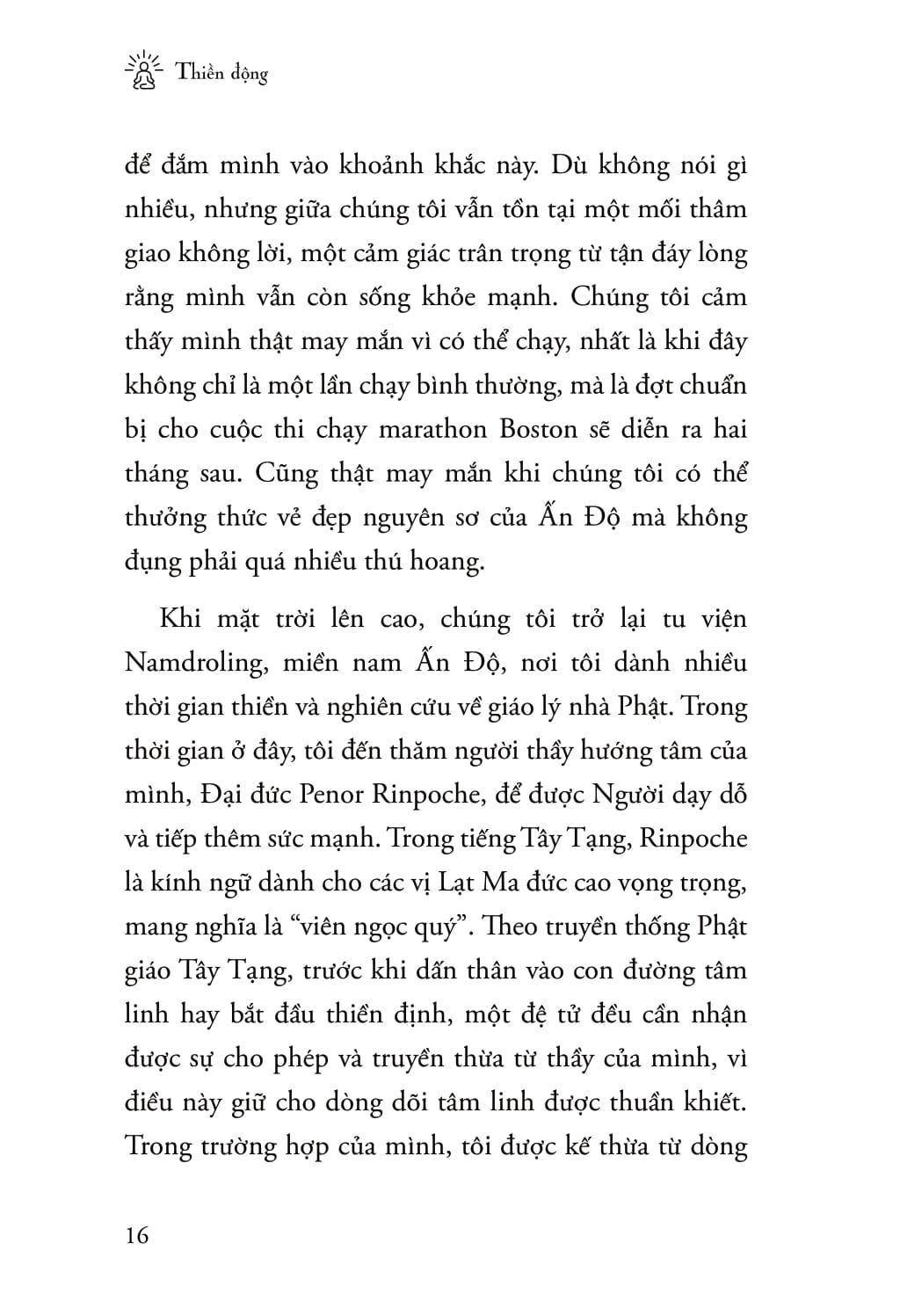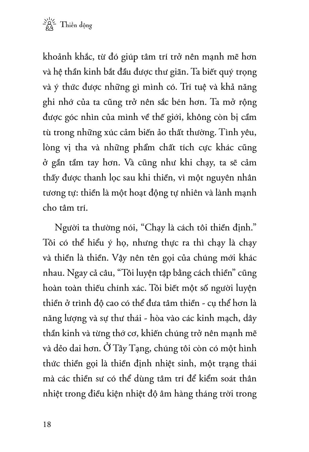 Cuốn sách “Thiền động” của Sakyong Mipham là một tác phẩm độc đáo kết hợp giữa chạy bộ và thiền định, mang đến cho người đọc một hành trình tinh thần và thể chất đầy ý nghĩa. Là một Lạt ma Tây Tạng và lãnh đạo của Shambhala, Sakyong Mipham đã nhận ra rằng sức khỏe tinh thần không thể tách rời khỏi việc vận động cơ thể. Dù đã được đào tạo về cưỡi ngựa và võ thuật, nhưng ông tìm thấy niềm đam mê và sự giải thoát trong việc chạy bộ. Từ đó, cuốn sách này ra đời, nhằm hướng dẫn người đọc cách kết hợp giữa hai hoạt động để cải thiện cả tâm trí lẫn thể lực.