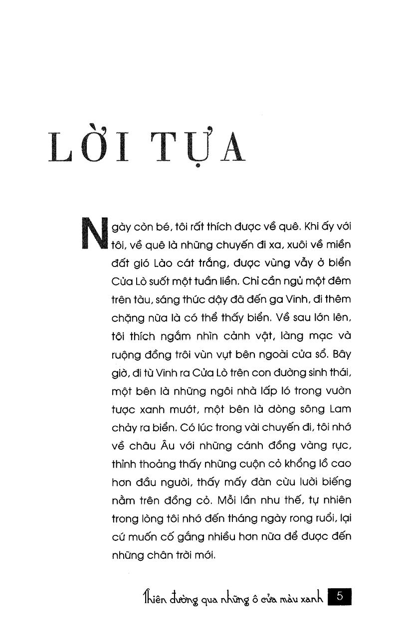 Thiên đường qua những ô cửa màu xanh không chỉ là ghi chép du lịch trong hành trình qua các nước châu Âu, mà còn gom góp những trải nghiệm đẹp đẽ trong suốt quá trình học tập tại Anh của tác giả Na Hồ. Tác giả đã có những khi da diết mong được quay trở lại nước Anh, trở lại châu Âu, gác lại hết những bộn bề công việc, để được tự do tung tăng trên những con đường kia. Trong cuộc sống này, có thể chỉ cần “du lịch” bằng trí tưởng tượng, hoặc những thông tin, hình ảnh, video trên mạng Internet cũng có thể hiểu được phần nào về cuộc sống cũng như con người ở những vùng đất khác. Nhưng, nếu có cơ hội, chỉ cần đôi chân bước đi, những trải nghiệm thực tế chẳng phải sẽ tuyệt vời hơn hay sao?