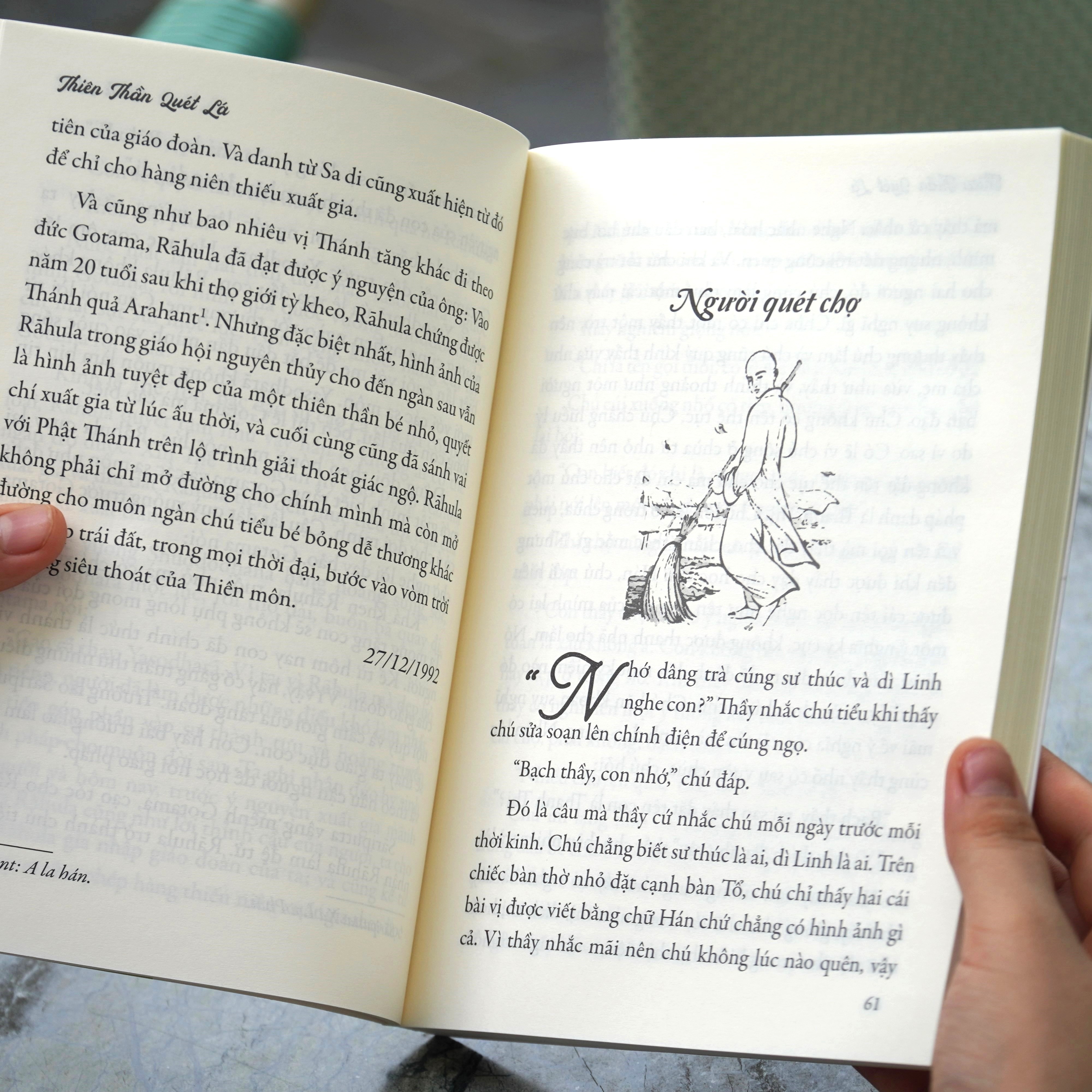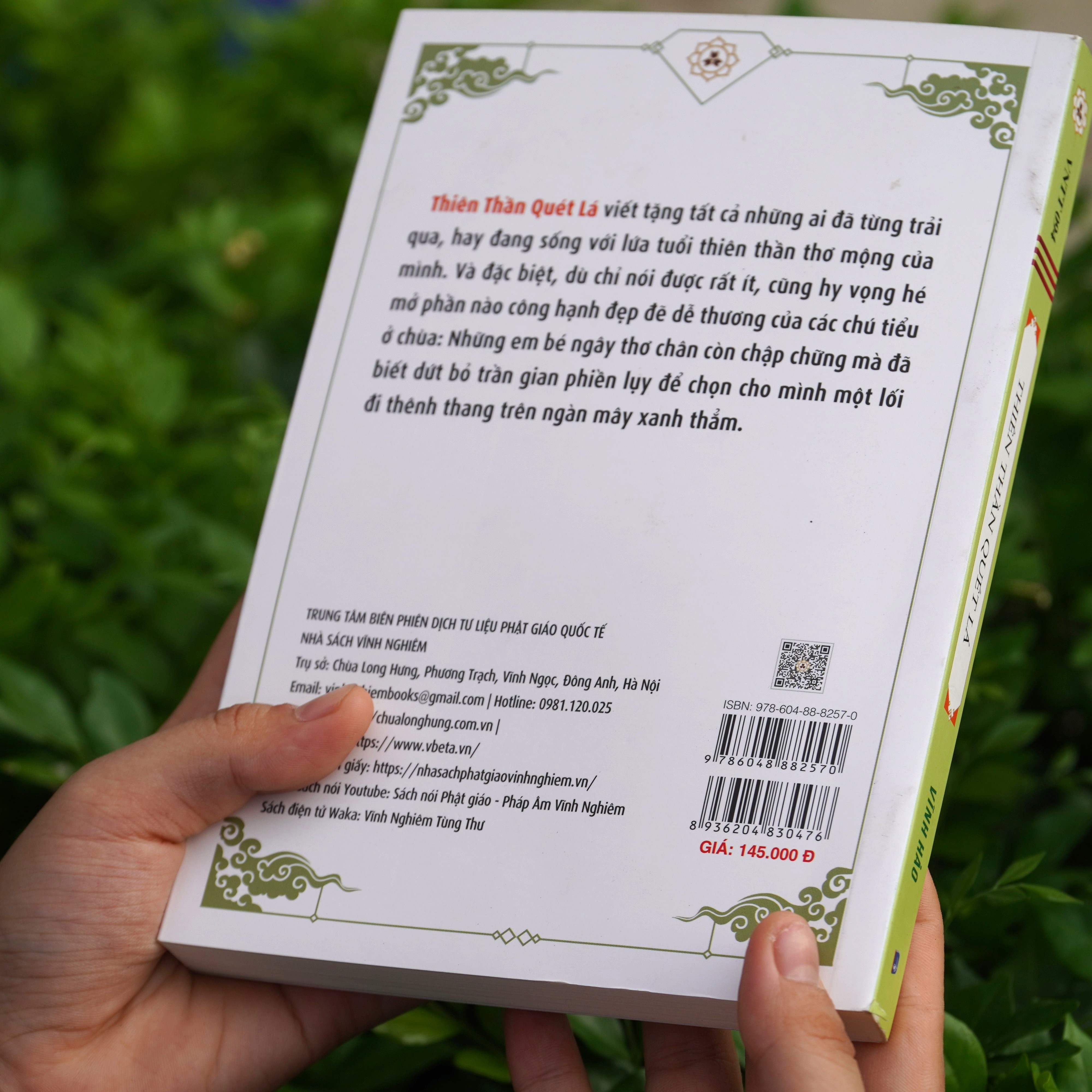 “Thiên Thần Quét Lá” là một trong những tác phẩm văn học Phật giáo đáng chú ý, được viết dành tặng cho những ai đã từng trải qua hoặc đang sống trong lứa tuổi thiên thần thơ mộng của mình. Cuốn sách mang đến những câu chuyện chân thực, gần gũi về cuộc sống của các chú tiểu ở chùa. Dù chỉ bằng những lời giản đơn, tác giả mong muốn hé mở phần nào vẻ đẹp tinh khiết, đáng yêu của các em bé ngây thơ, những người mà chân còn chập chững nhưng đã biết dứt bỏ những phiền lụy của trần gian để chọn cho mình con đường thanh thản, thênh thang trên ngàn mây xanh thẳm.