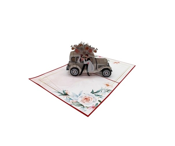 Tạo bất ngờ cho ngày trọng đại với thiệp 3D Pop Up xe cưới Just Married. Khi mở ra, chiếc xe cưới màu đỏ nổi bật bật lên đầy sống động, trang trí hoa tươi