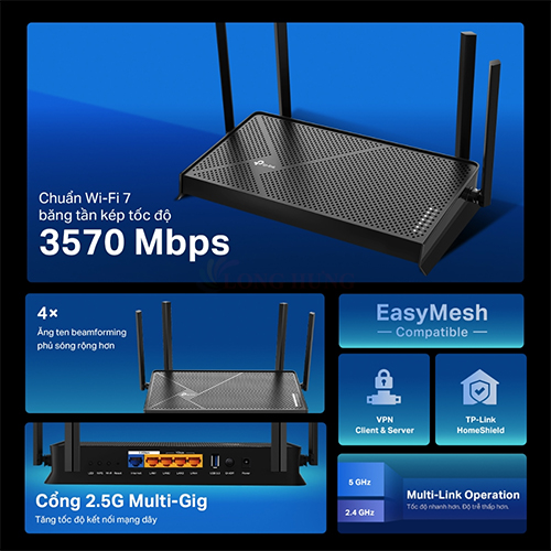 Chuẩn Wi-Fi 7 tốc độ đến 3.6 GbpsBăng tần kép 2.4GHz (688 Mbps) + 5GHz (2880 Mbps)Multi-Link Operation (MLO) giảm độ trễ vượt trộiCông nghệ OFDMA & MU-MIMO tối ưu đa thiết bị2 ăng-t...