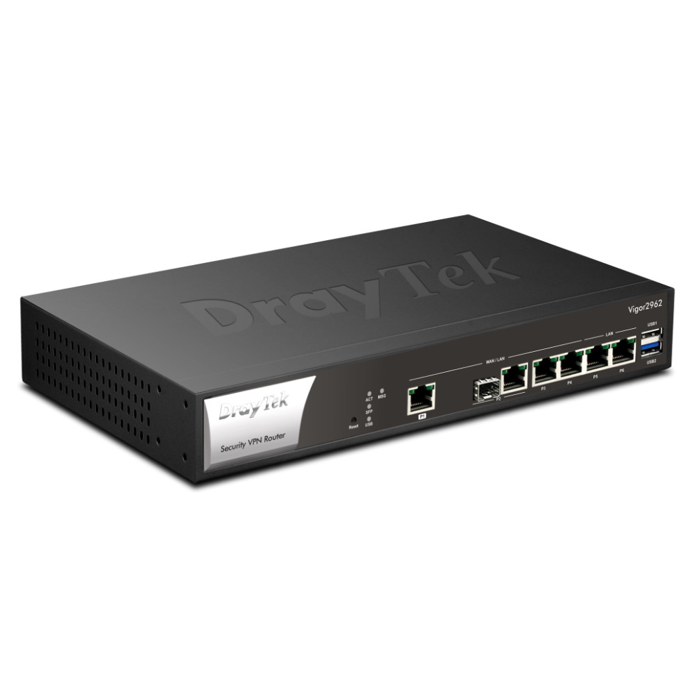Thiết bị mạng DrayTek Vigor2962 Enterprise high performance dual-gigabit WAN Firewall VPN router – 2 Gigabit WAN port (1 x 2.5GbE & 1 x SFP/GbE combo & 2 x GbE) – 4 Gigabit LAN port