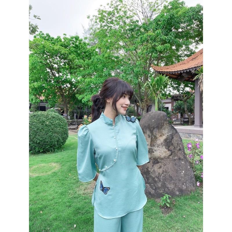 ✨thời trang nữ, lụa cổ tàu đính bướm, đồ đi chùa, đồ lam cao cấp