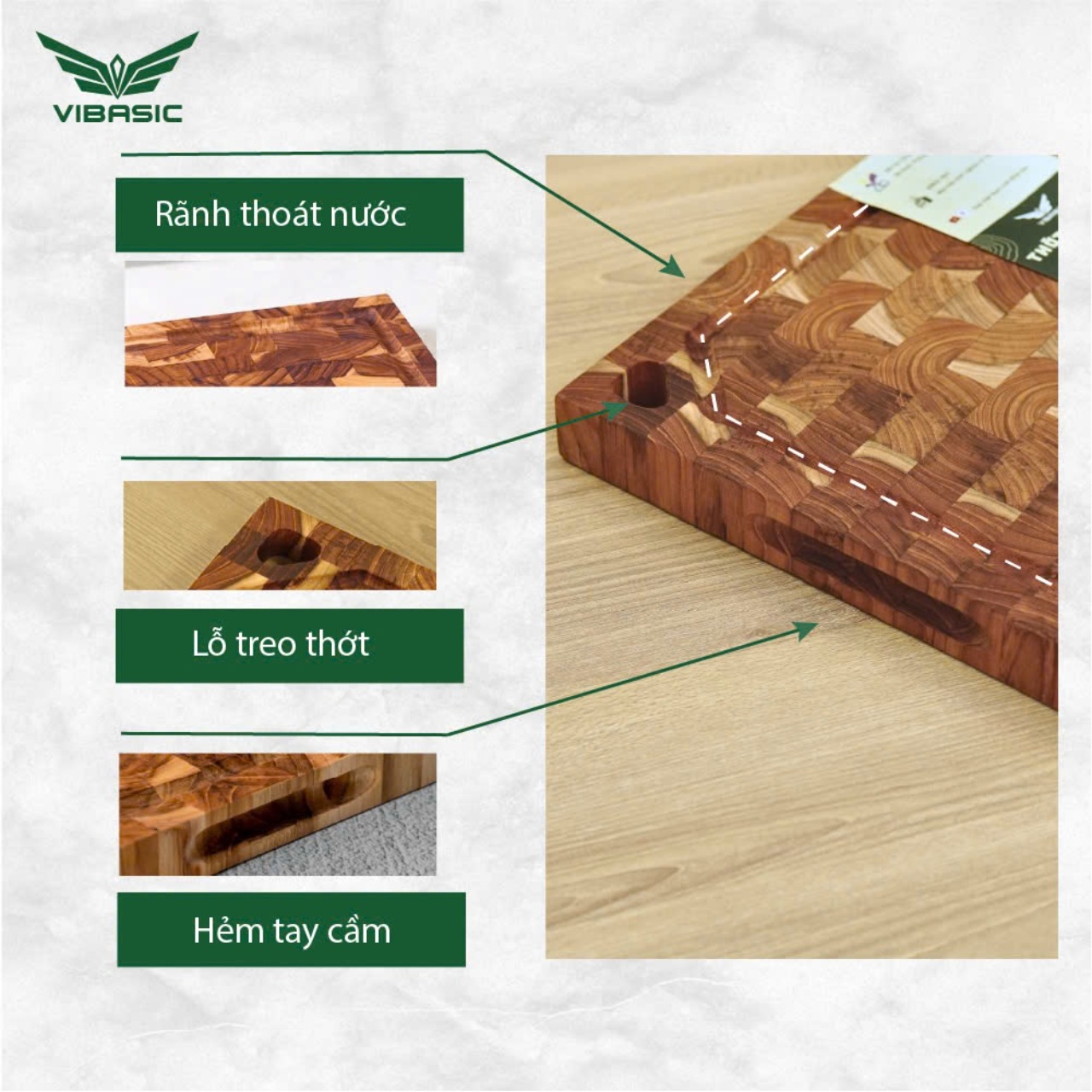 Thớt gỗ Teak Vibasic ghép dựng block kích thước 400x300x38mm, dùng để chặt I.Đặc điểm nổi bật - Được sản xuất tại nhà máy ra đời năm 1967- 56 năm kinh nghiệm - Đối tác