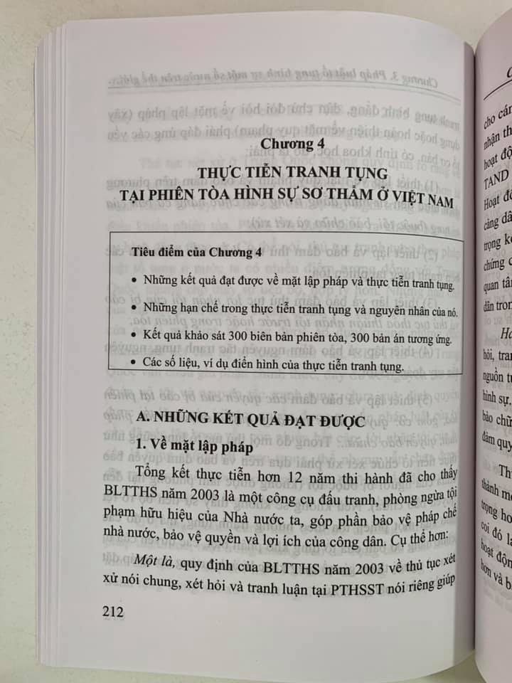 Tại Chương này, tác giả đã khái quát (1) những kết quả đã đạt được, những hạn chế, vướng mắc trong tranh tụng tại phiên tòa hình sự sơ thẩm (có ví dụ về diễn biến một phiên tòa hình sự sơ thẩm cụ thể để tác giả đưa ra những nhận xét để chứng minh cho những nhận định nêu trên); nguyên nhân của những hạn chế vướng mắc trong thực tiễn tranh tụng tại phiên tòa hình sự sơ thẩm.